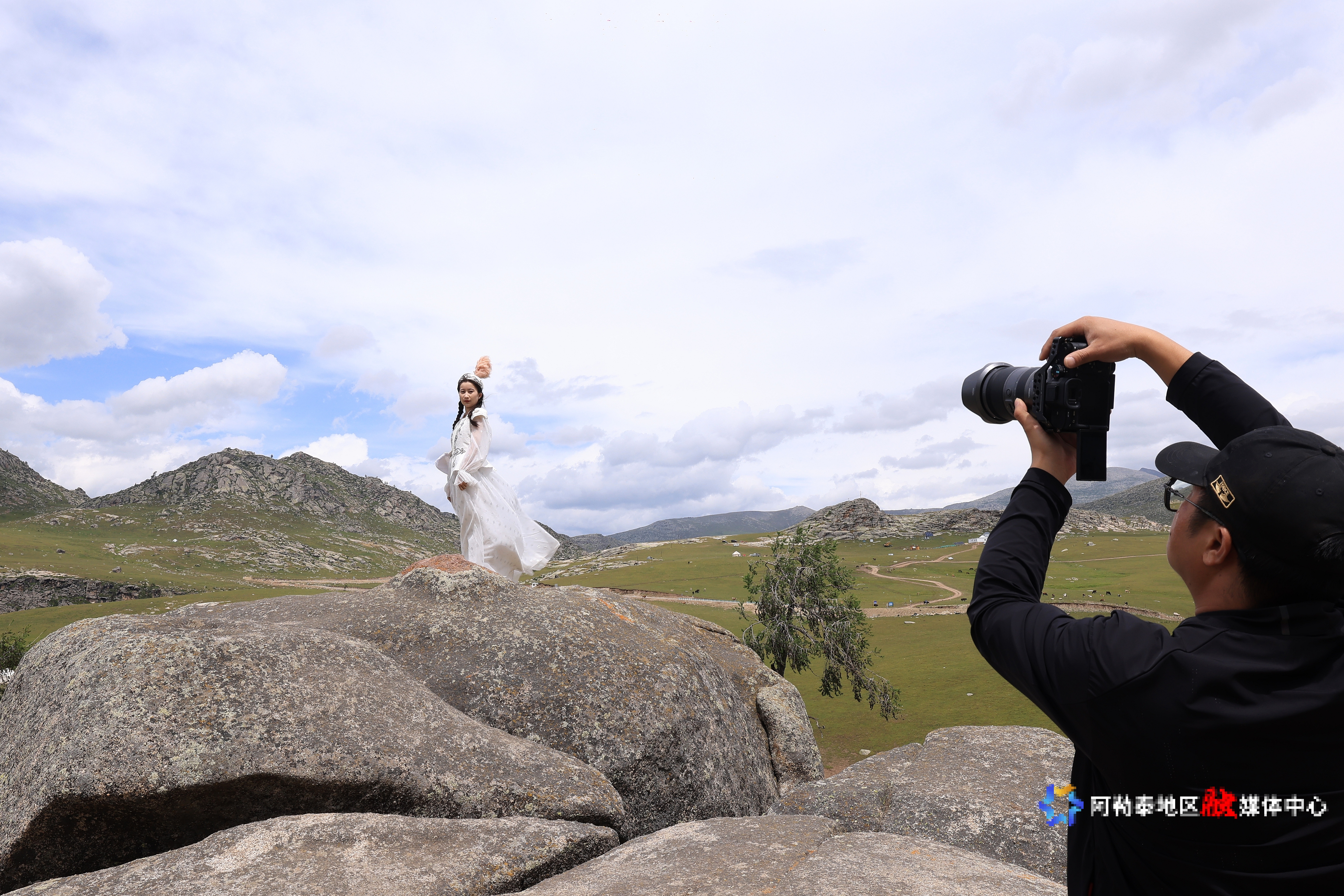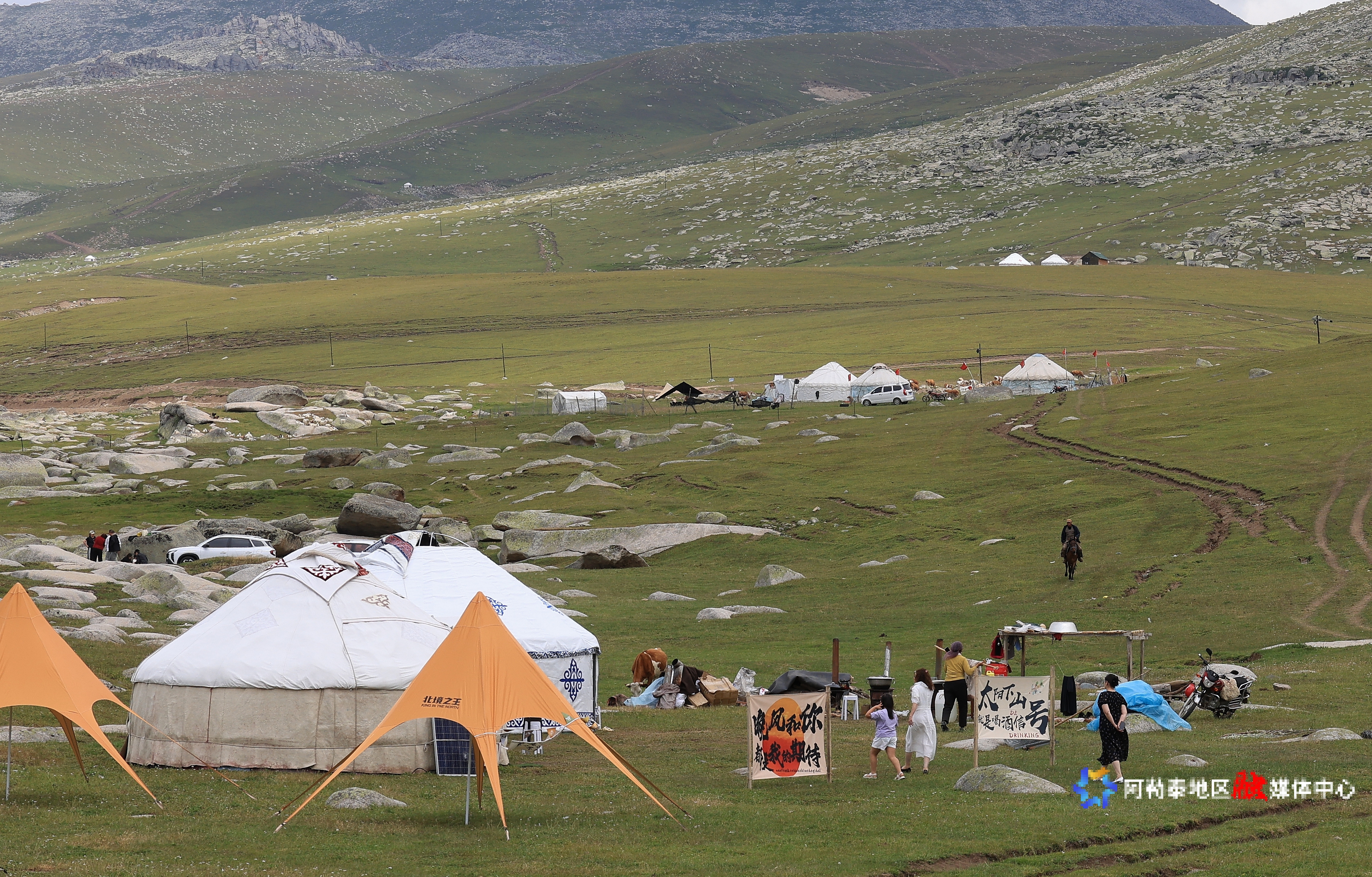 在乌希里克草原,阿勒泰市红墩镇公共文化服务中心的工作人员为大家带来了欢快的表演,欢乐的氛围吸引了山东游客尹作平的加入。“我是一名音乐爱好者,平时都是自己玩。没想到一路开车到阿禾公路,碰到文艺工作者在即兴表演,他们的音乐和歌声打动了我。我立刻从车里带上我随身带的非洲鼓跟他们合奏一曲,非常尽兴!有这么好看的天地为舞台,我感觉这是听到的最舒服的一次演奏。”