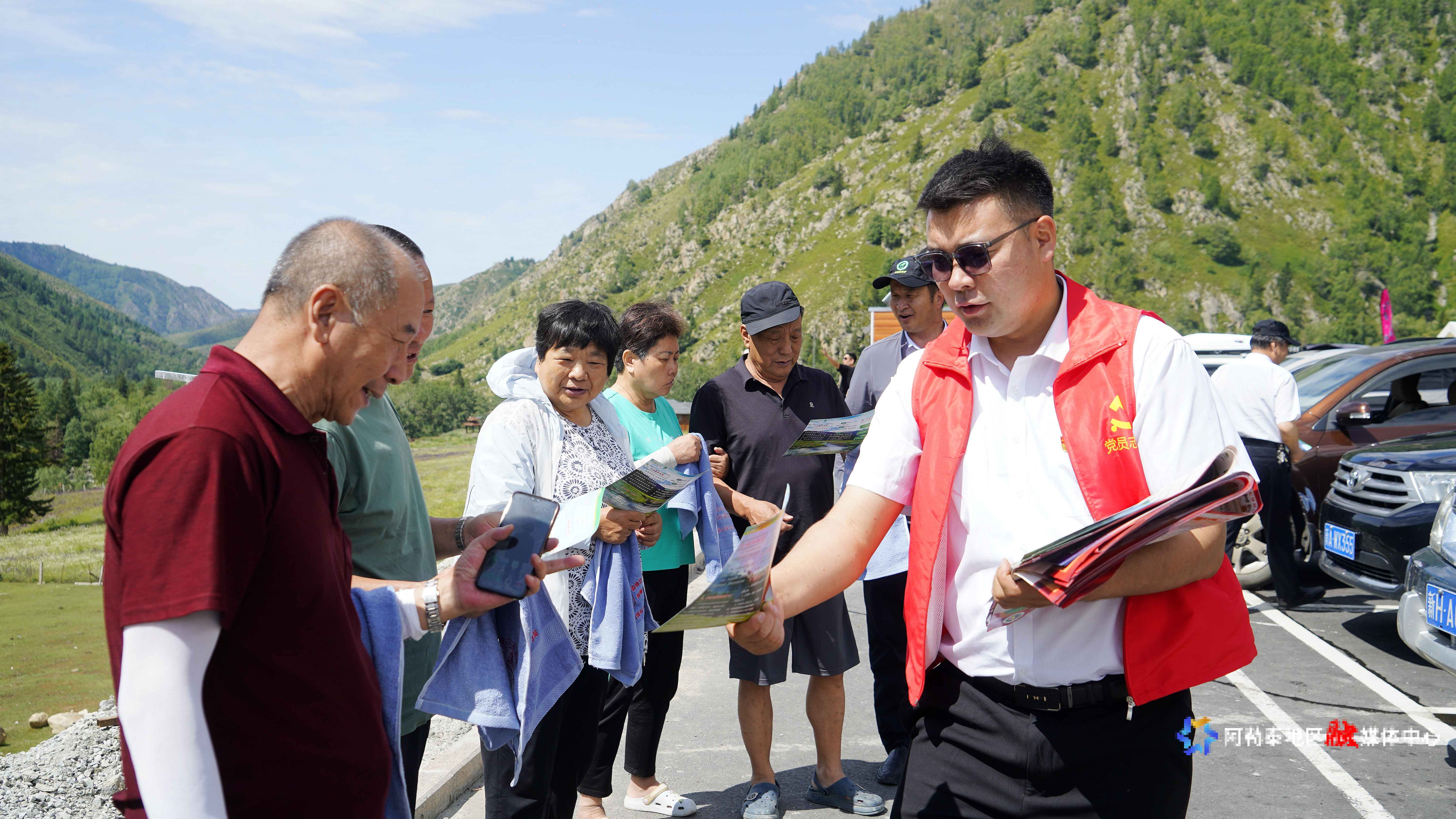 2025年7月1日,阿尔泰山国有林管理局及阿勒泰分局党员干部在阿禾公路上给游客讲解环境保护知识。记者 阿尔达克·拜斯汗 摄