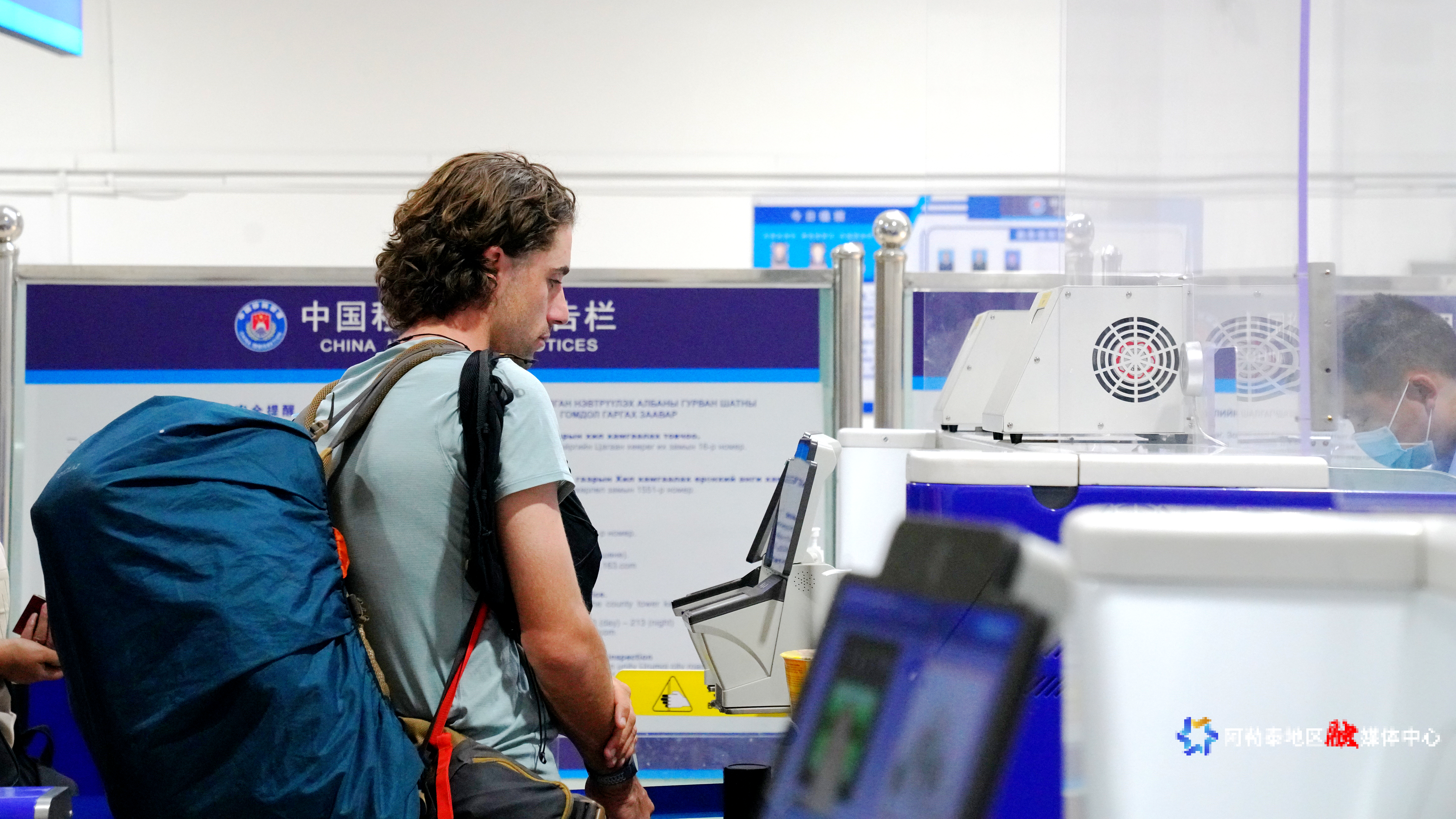 7月4日,正在塔克什肯口岸联检大厅办理通关手续的法国游客Laurent Chalut说:“中国人很友好,每次我们需要帮助,工作人员都会提供很多有用信息。”