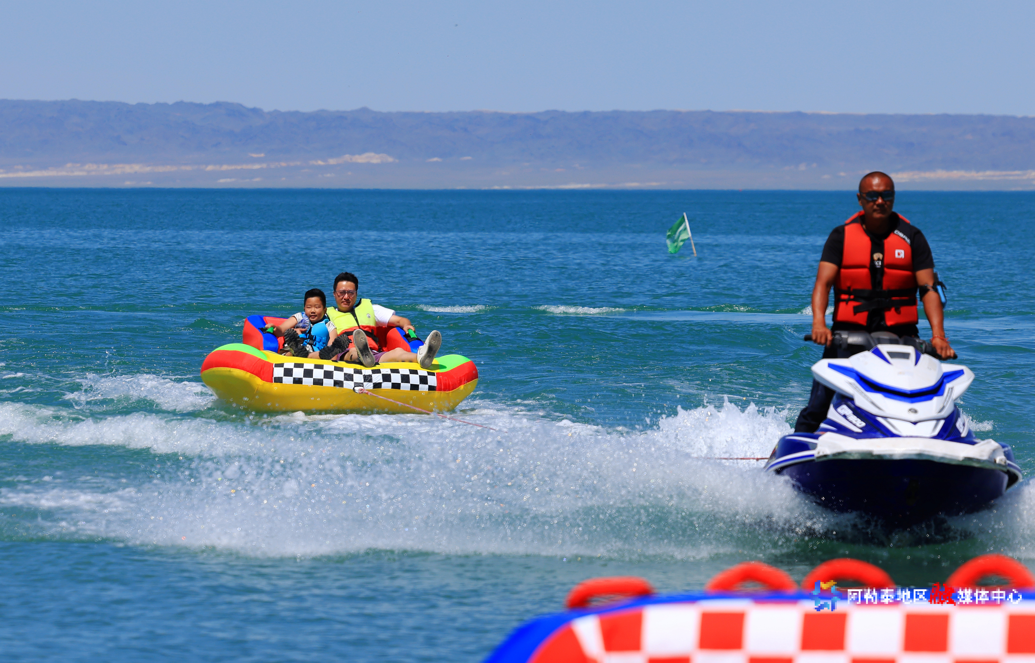 2025年7月5日,福海县乌伦古湖景区,游客正在体验水上娱乐项目。记者 阿尔达克·拜斯汗 摄
