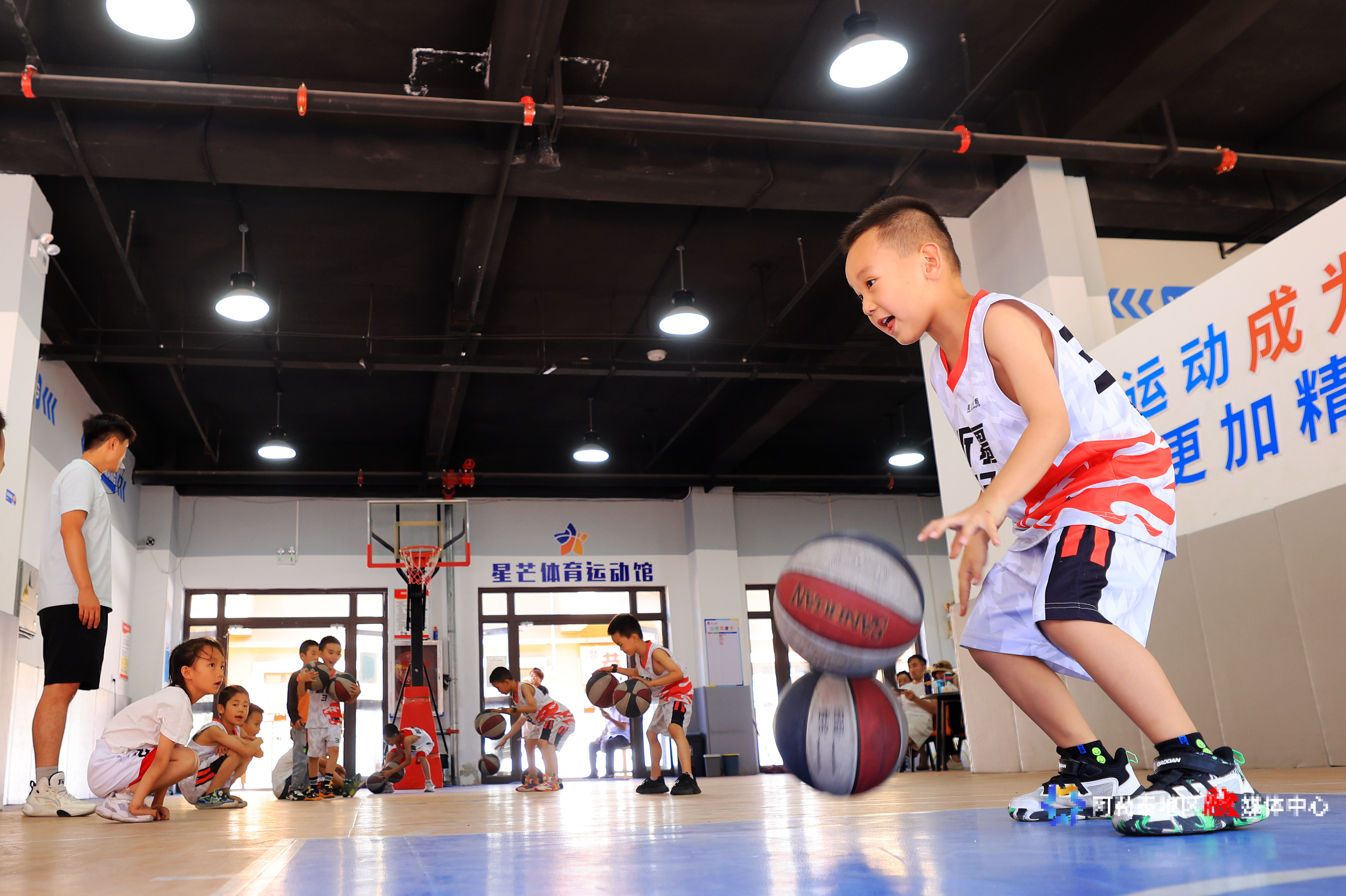 2025年7月10日,一家篮球训练营,孩子们在进行篮球训练。记者 阿尔达克·拜斯汗 摄