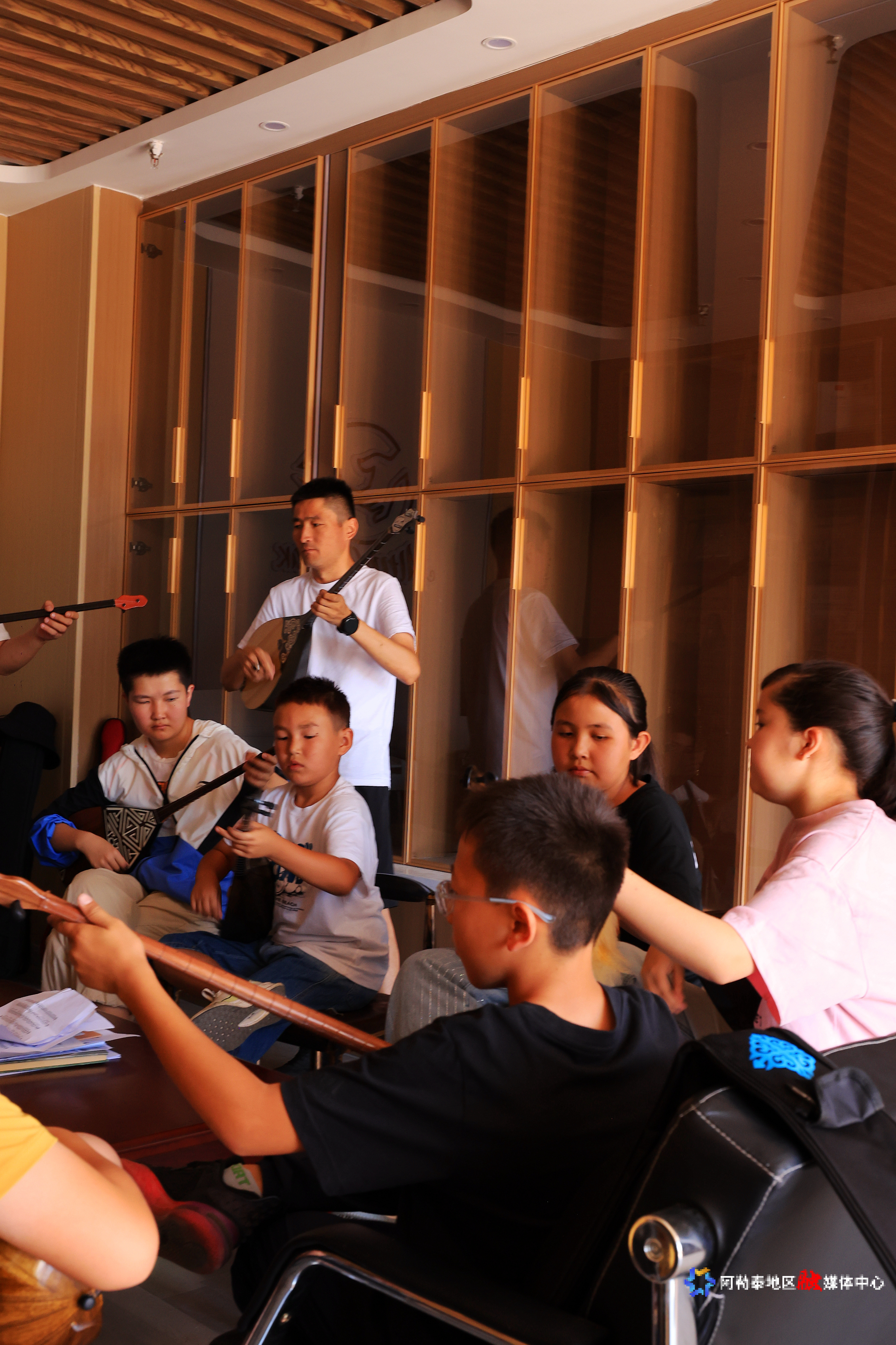 2025年7月11日,学生在老师的指导下,练习冬不拉音乐。记者 阿尔达克·拜斯汗 摄