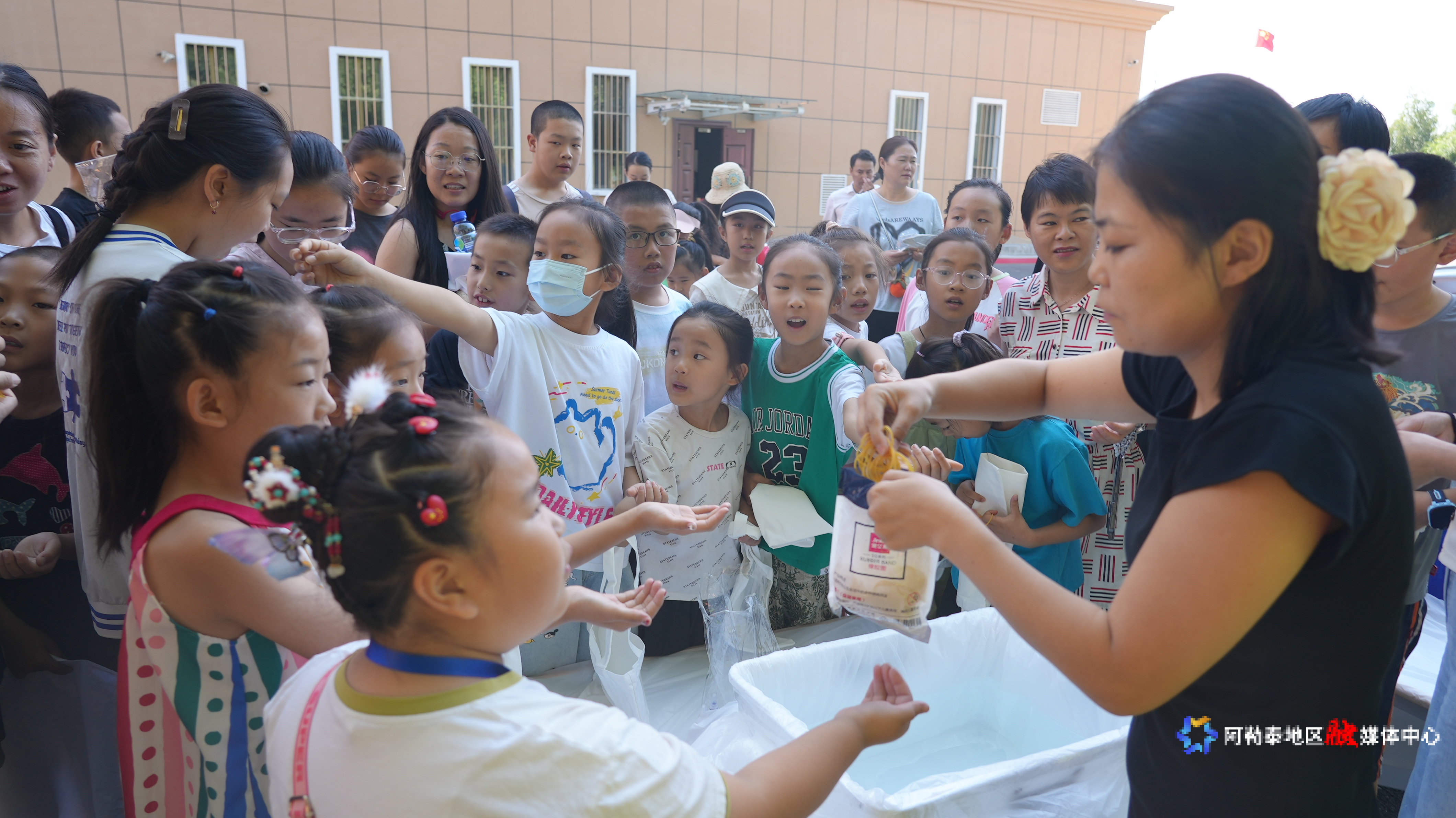“我觉得扎染很神奇,皮筋绑上去,然后染料渗进去的花纹就像古诗里说的‘留白’一样,原来不用笔也能画出意境!”阿勒泰市第二中学一年级学生汪小苏说。