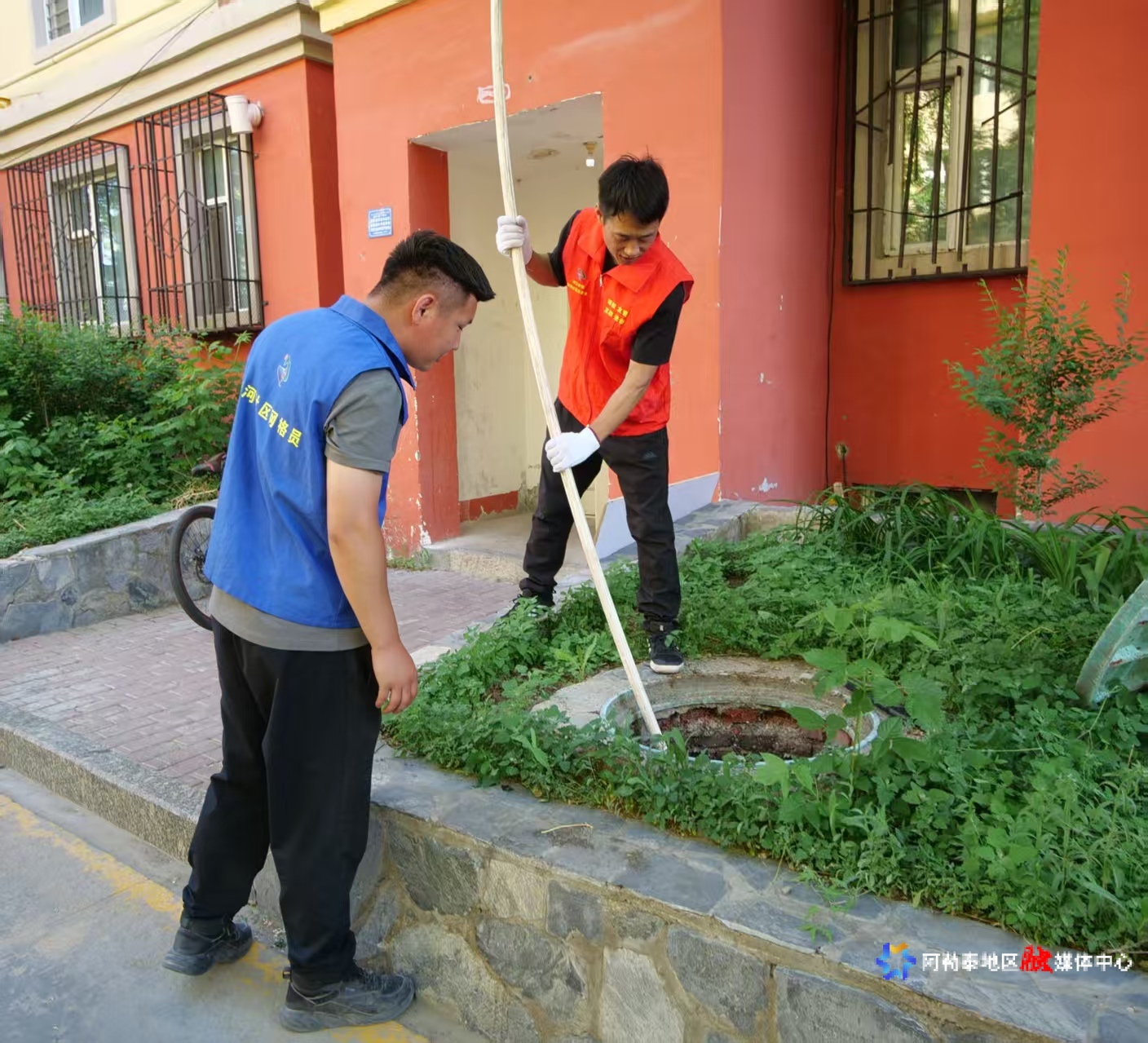 物业工作人员和志愿服务队员在额河社区津东小区疏通下水管道。