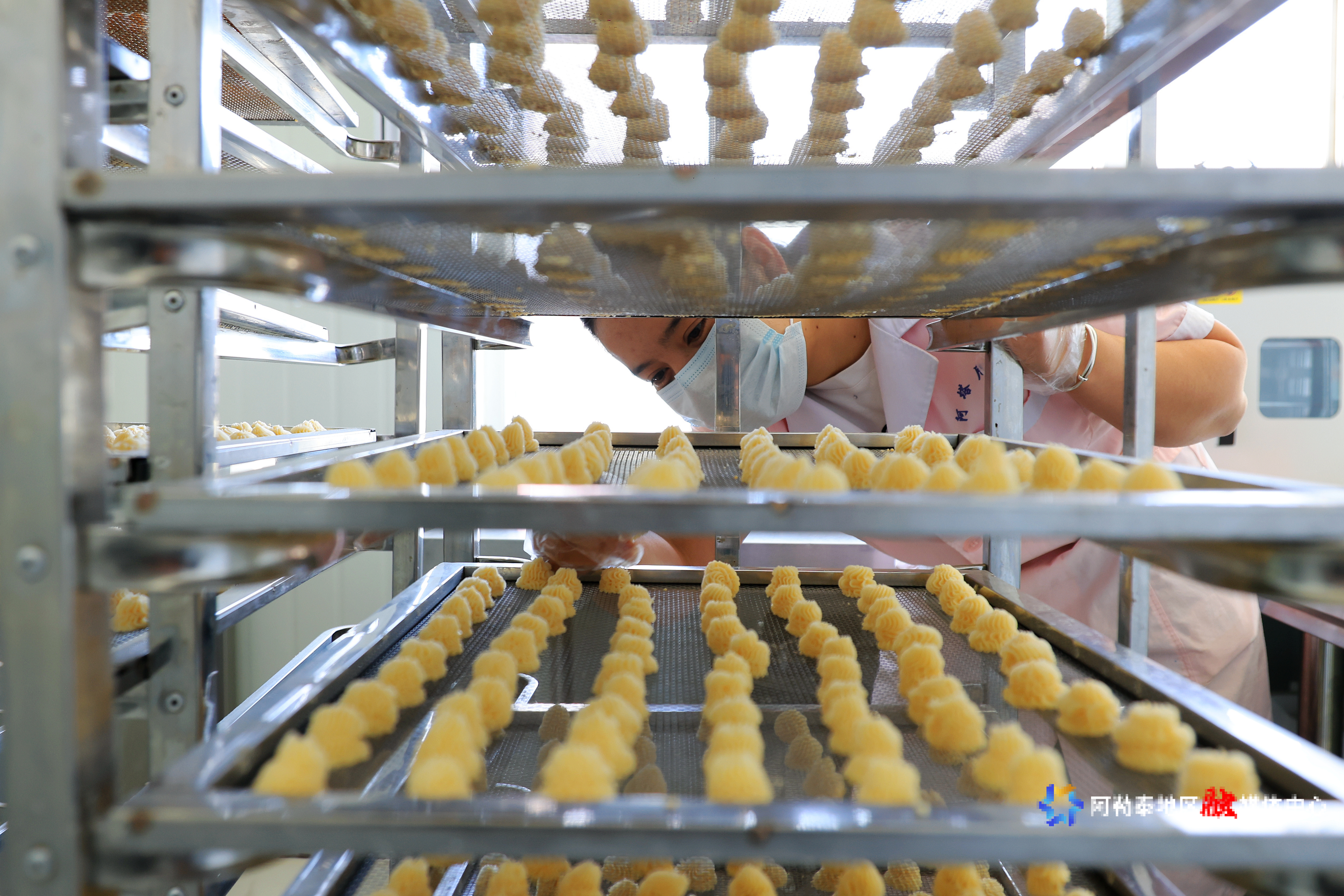 8月5日,公司员工在车间内晒干制作食品奶疙瘩。记者 阿尔达克·拜斯汗 摄