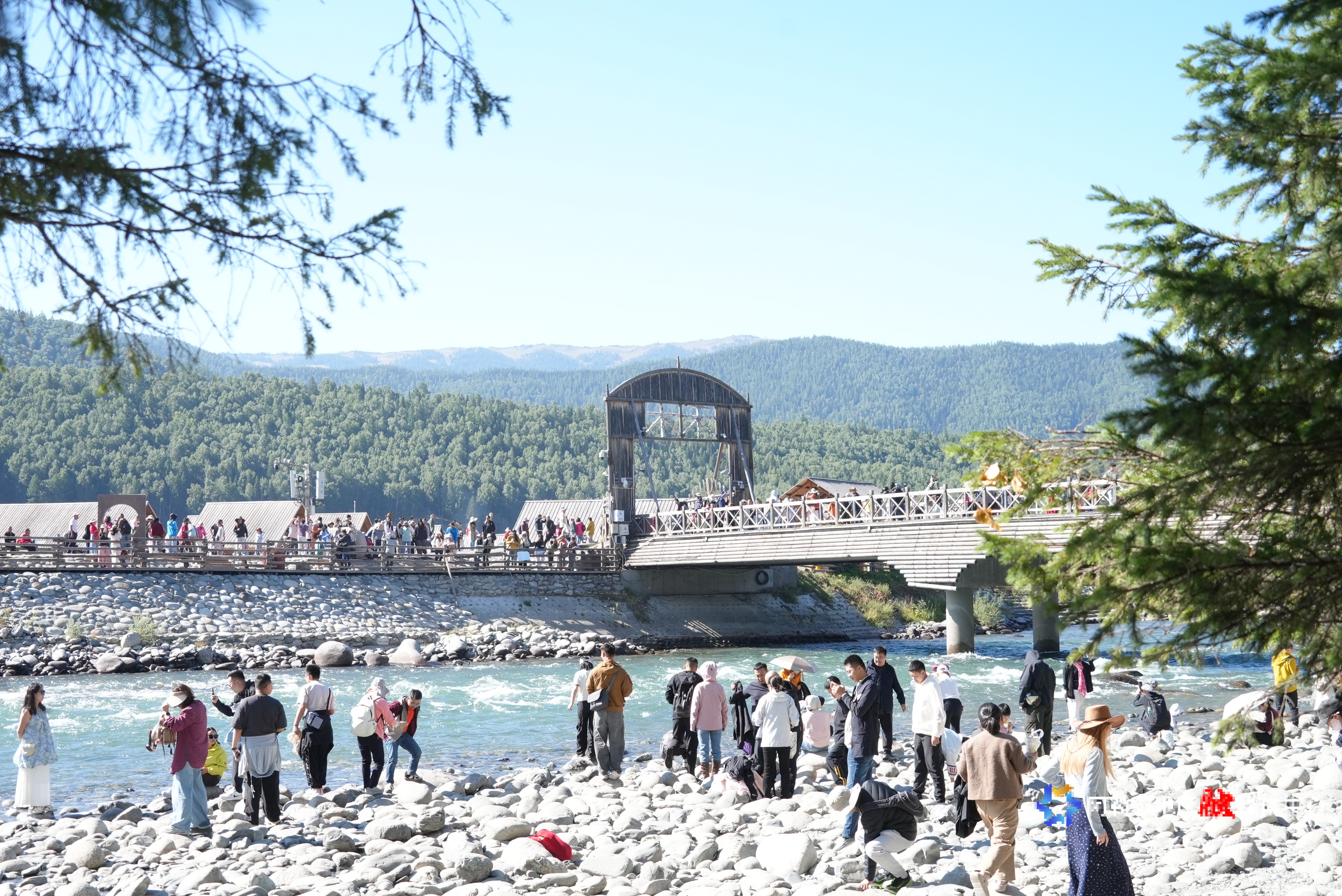 徒步至观景台俯瞰,整个村落的宁静之美尽收眼底;沿河谷徐行,原始森林与清澈溪流相映成趣,大自然的和谐乐章在此静静流淌。而禾木桥畔,更是游人必至的“时光驿站”——初秋的河水带着雪山融雪的清冽,在脚下石滩间叮咚作响,潺潺流水声将都市的喧嚣轻轻涤荡。站在桥上远眺,白桦与松林交织,马蹄声偶尔从远方传来,时光仿佛在此刻柔软成缠绵的情诗。