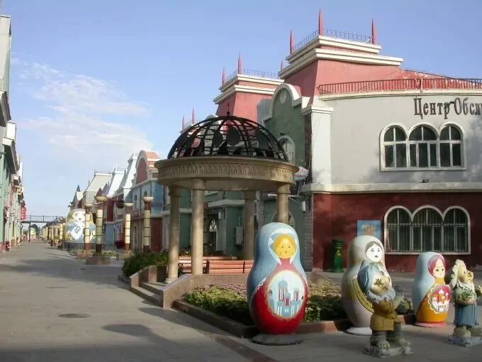 夕阳的余晖尽情地洒在眼前的俄罗斯风情步行街上。红的、黄的、蓝的、绿的墙体,因余晖而多了一层金黄色的纱衣。纱衣若隐若现,透着肌理与质感。身处河畔,遥望高耸入云的雪山,高山草甸的青草芬芳与自然多层重叠,毫无违和感。远景、中景、近景,独特的油画构图,瞬间在眼前展示和勾勒。刚刚在纪念馆看到的图片、实物,记录着千帆竞渡高峰时期,生活于此的人们。岁月如白驹过隙,时空在两鬓留白,却不曾忘记中俄友谊的情深谊长。