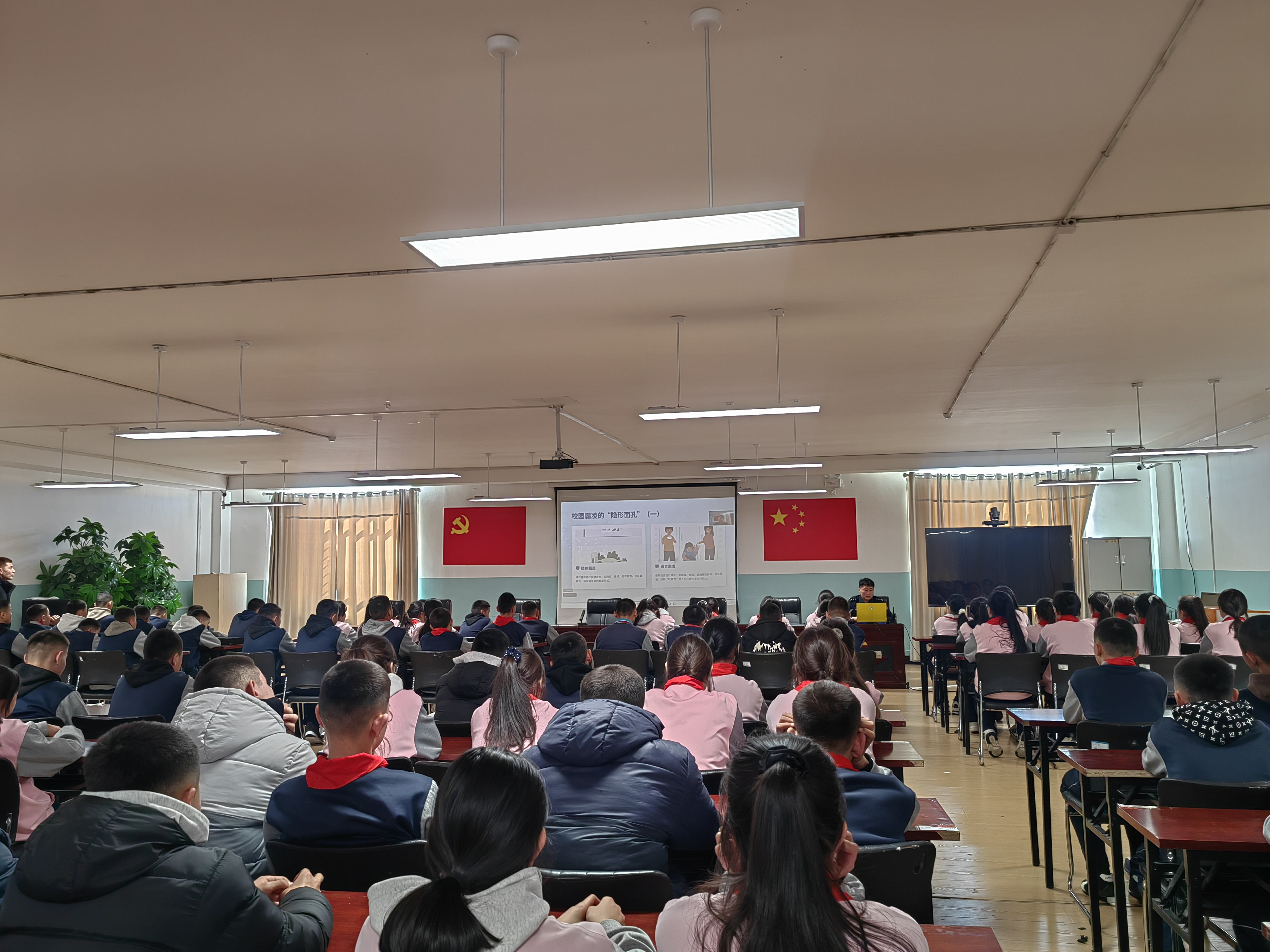 针对全体学生,授课则聚焦与青少年息息相关的防范电信网络诈骗和预防校园欺凌(霸凌)两大主题。民警用通俗易懂的语言、生动形象的案例,向学生们揭示了常见诈骗手段和识别技巧,提醒大家牢记“不听、不信、不转账”的防诈口诀。同时,深入浅出讲解了校园欺凌的表现形式、危害性及应对方法,教育引导学生们要勇敢向欺凌说“不”,学会自我保护,懂得寻求帮助,共同抵制校园暴力,营造积极阳光的校园氛围。