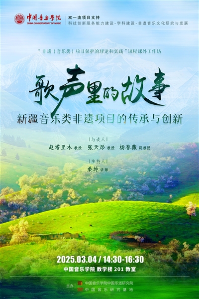非遗传承与保护是青年学者、非遗人共同激活中华优秀传统文化的路径。冬不拉弹唱等非遗艺术是中华文明标识之一,在文明传播中具有本源性、敞开性、对话性等特点。阿勒泰非遗文化艺术转化为铸牢中华民族共同体意识鲜活的经验,具有典型性。这是最近在中国音乐学院举办的 “非遗音乐文化工作坊”活动上,与会专家学者在研讨中形成的关于非遗艺术田野经验与实践经验的共识。2025年3月4日下午,由中国音乐学院中国乐派研究院、中国音乐研究基地主办的“非遗(音乐类)项目保护的理论和实践”课程课外工作坊——“歌声里的故事:新疆音乐类非遗项目的传承与创新”活动在中国音乐学院教学楼201教室成功举办。活动聚焦新疆若干音乐类非物质文化遗产项目,通过艺术展演、学术对话与互动交流,展现了传统音乐在全球化语境与现代社会中的蓬勃生命力。