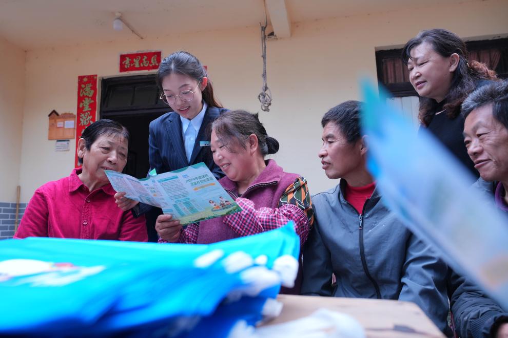 2023年11月1日,在重庆市北碚区歇马街道文凤村,街道医保政务服务分中心工作人员给村民宣讲医保政策。新华社发(秦廷富 摄)