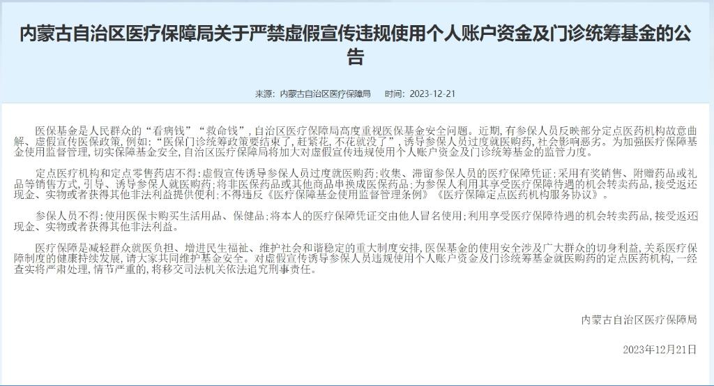 临近年底,几则关于医保的“内部消息”在网上广泛传播:“医保门诊统筹截止到12月底就不报销了”“药店已停止统筹额度支付”“2024年职工医保费将不再划入个人账户”“个人将不再有自己的医保账户”,等等等等。