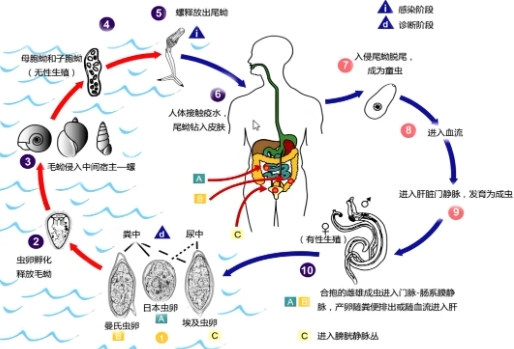 血吸虫的发育分为虫卵、毛蚴、母胞蚴、子胞蚴、尾蚴、童虫及成虫共七个阶段,其中尾蚴是可以感染人体的阶段。尾蚴在水中接触到人的体表后可侵入人体。有实验证明,宿主动物只要接触尾蚴10秒,就可被感染。