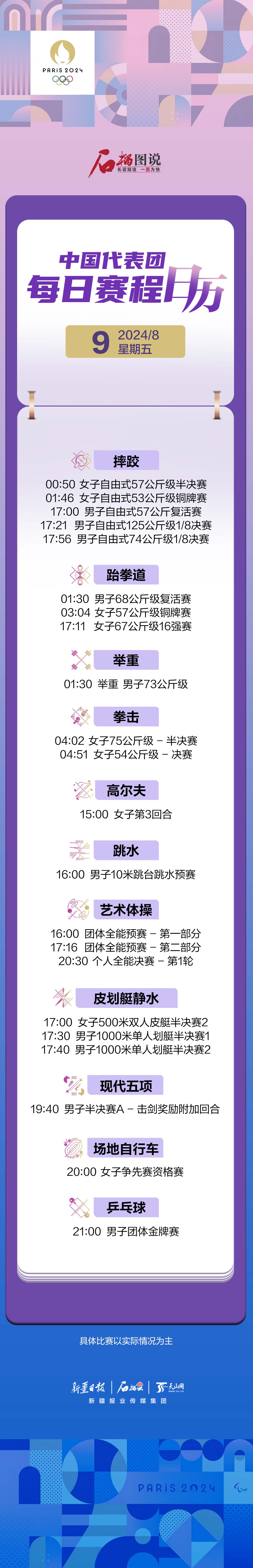 石榴图说丨2024年巴黎奥运会中国代表团每日赛程日历:8月9日