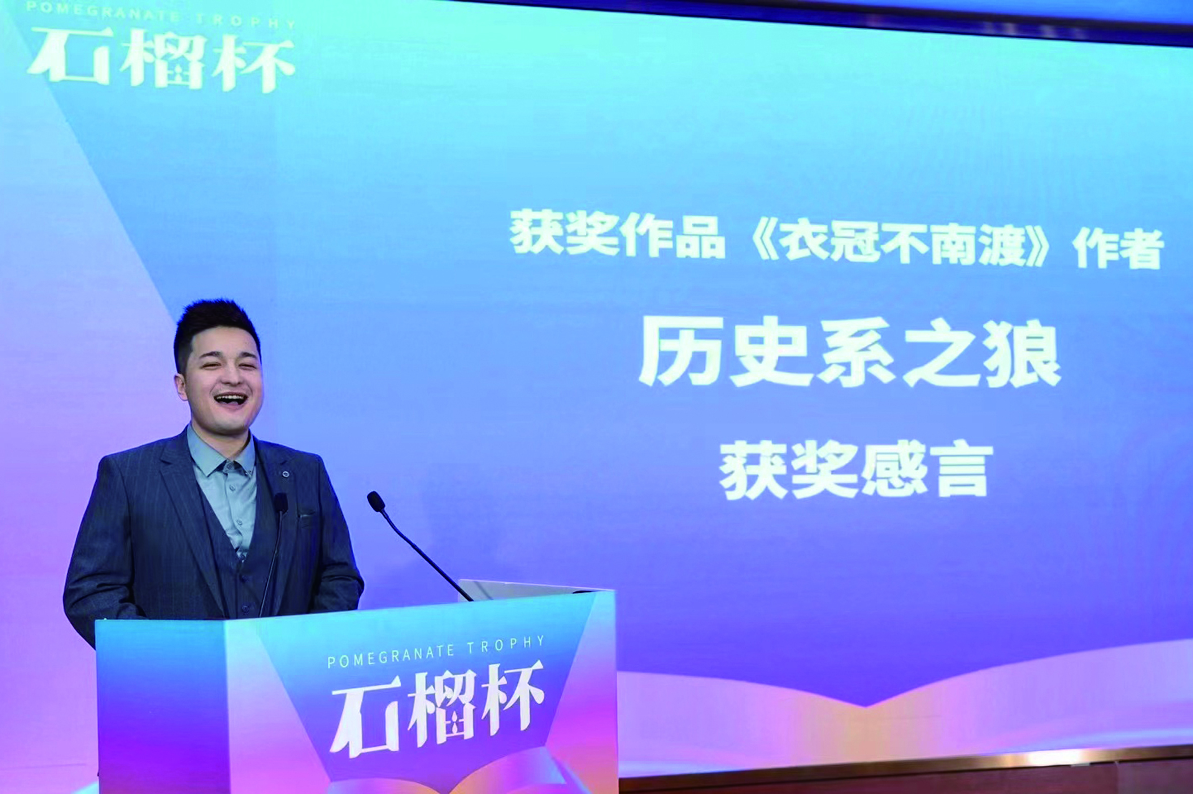 网络作家艾力塔姆尔·排尔哈提在作品《衣冠不南渡》获得“石榴杯”时发表感言。艾力塔姆尔·排尔哈提供图
