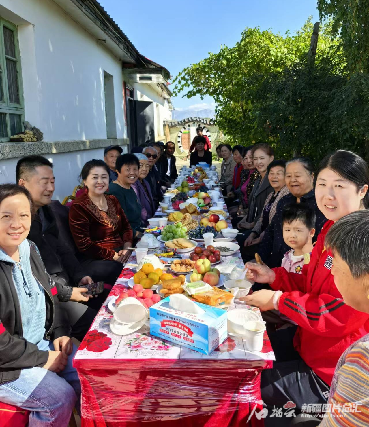 葡萄架旁,白桦树下,长条桌上月饼、馓子、奶疙瘩、果酱、葡萄、苹果摆得满满当当,奶茶的醇香扑鼻而来。红墩镇30多位居民坐在桌前,谈笑风生。大院女主人李红秀跑前跑后忙个不停。