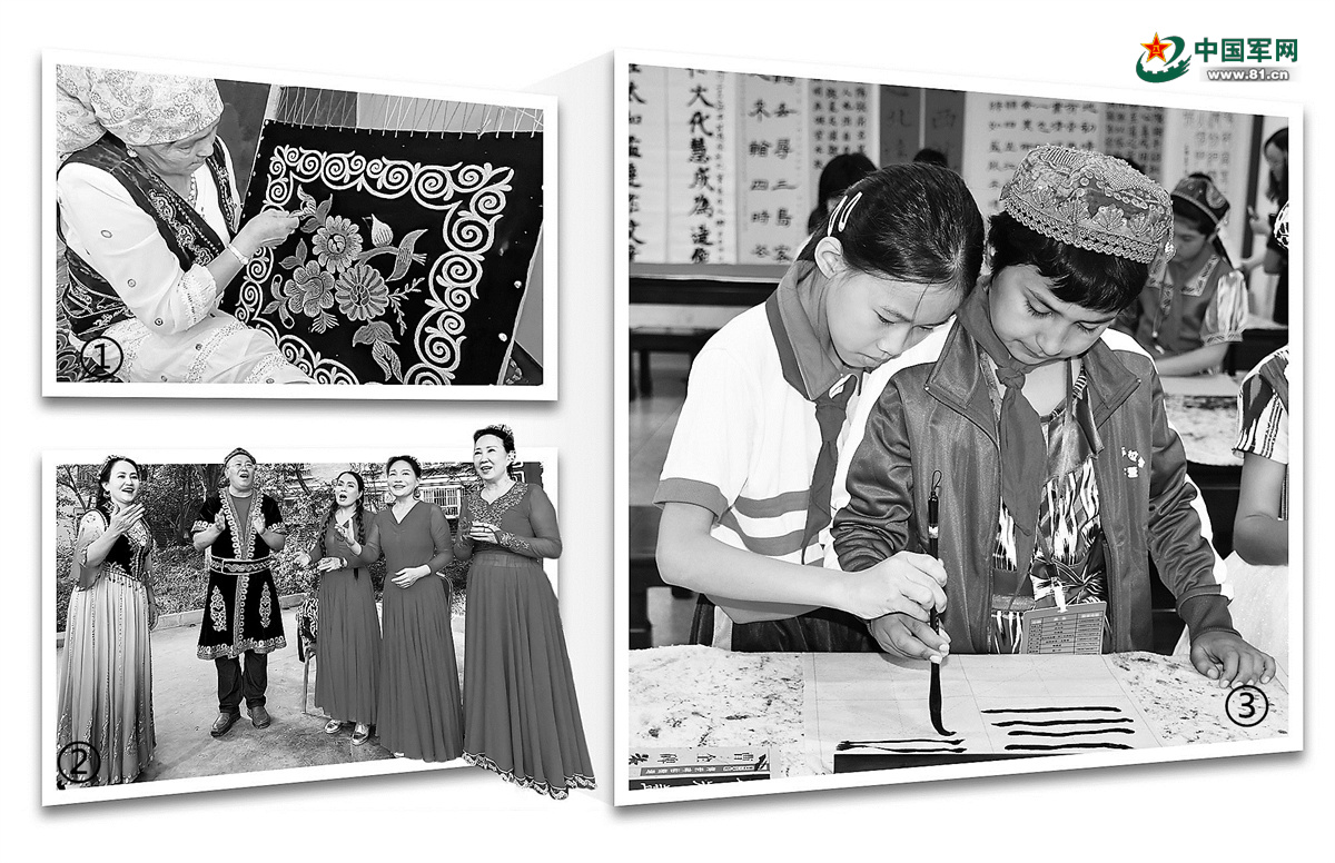 图①:在新疆生产建设兵团第六师五家渠市红旗农场民族刺绣工作室,绣娘正在制作毡绣。解放军报实习记者 刘颖函 摄