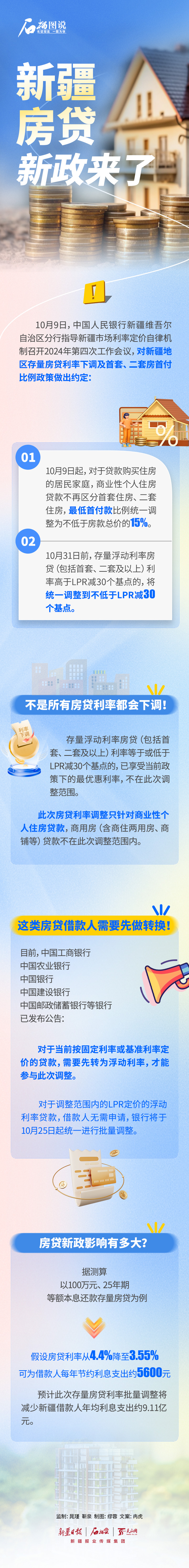 10月9日,中国人民银行新疆维吾尔自治区分行指导新疆市场利率定价自律机制召开2024年第四次工作会议,对新疆地区存量房贷利率下调及首套、二套房首付比例政策做出约定: