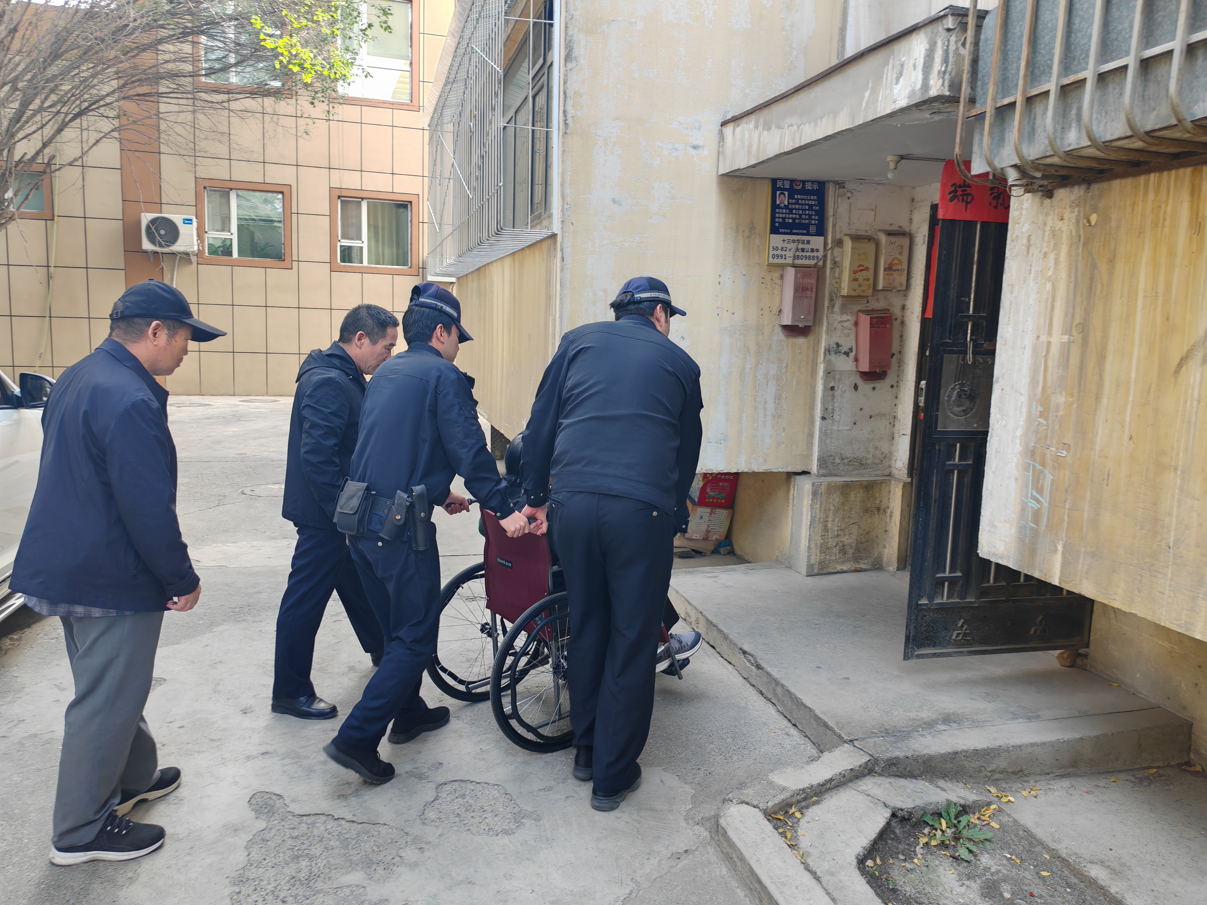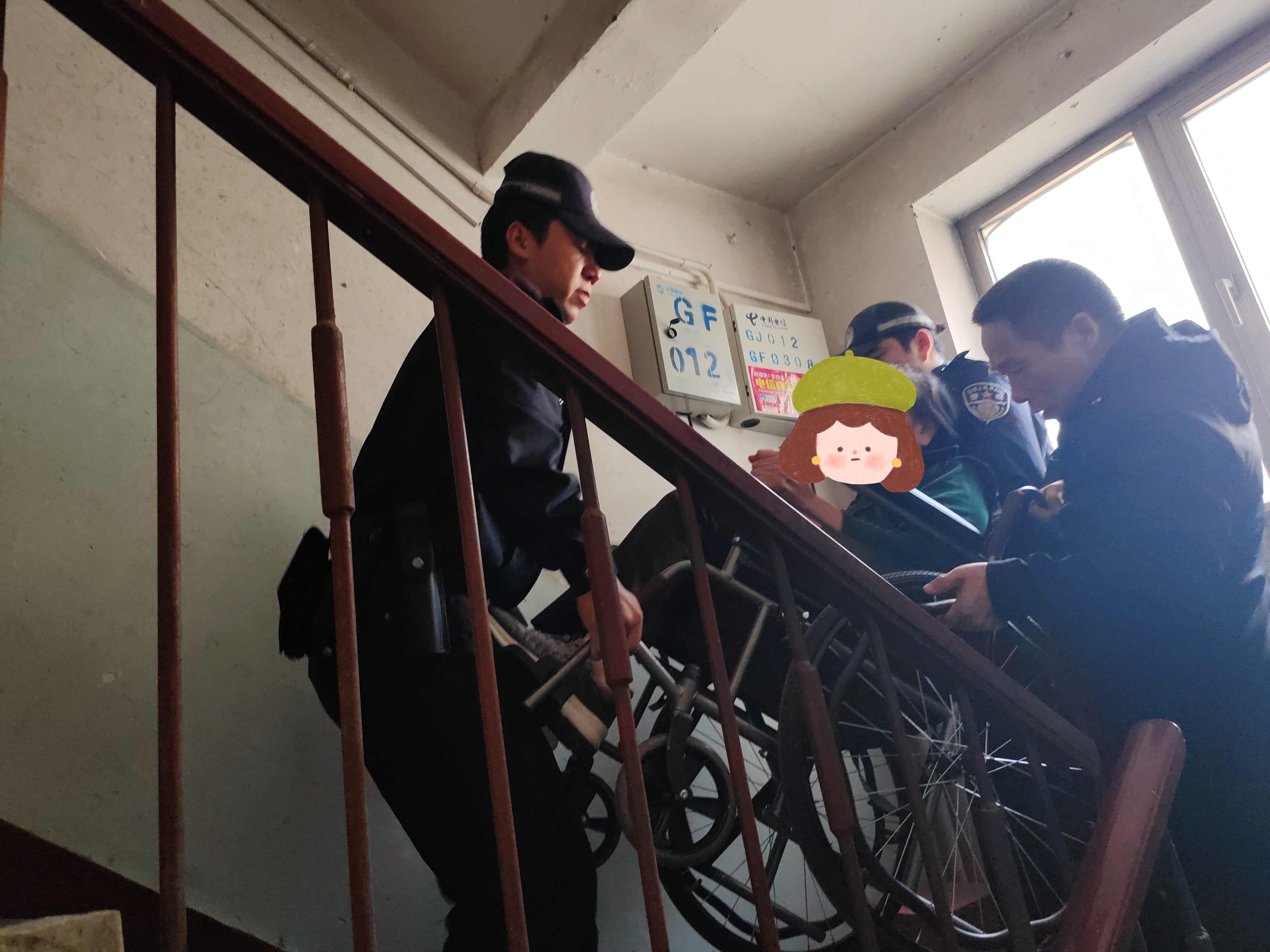 了解情况后,民警连忙叫上警务站的同事一同来到了赵女士家楼下。根据现场情况,民辅警们配合赵女士的家人如同抬担架一般,小心翼翼地抬起轮椅,一步一个台阶,将老人抬上了4楼的家中,小区内围观的居民纷纷对民警竖起了大拇指。