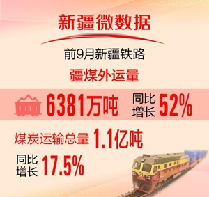 前9月,新疆铁路煤炭运输总量1.1亿吨,同比增长17.5%,疆煤外运量占一半以上。