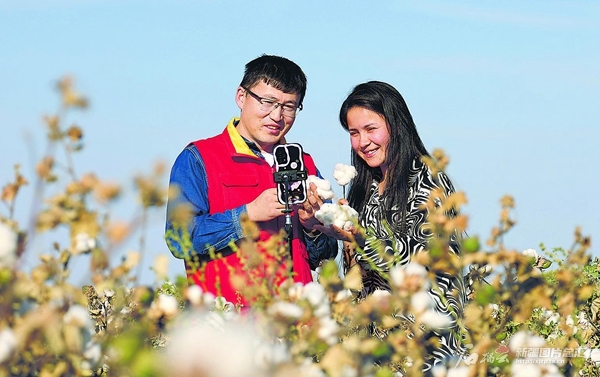 10月12日,国网新疆电力有限公司克州供电公司驻阿图什市格达良乡沙拉塔拉村工作队队员和村民在一处棉田通过直播介绍当地棉花。翟汝增摄