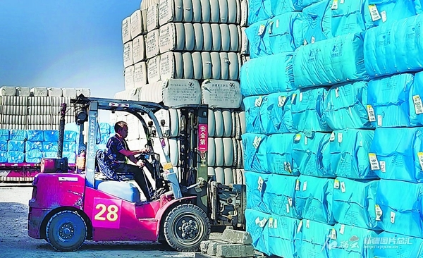 10月15日,位于巴楚县的新疆中新建现代物流股份有限公司员工驾驶叉车装运皮棉。该公司主要从事棉花仓储物流、棉籽收购加工和皮棉销售等业务,可储存皮棉48万吨至60万吨。陈敏摄