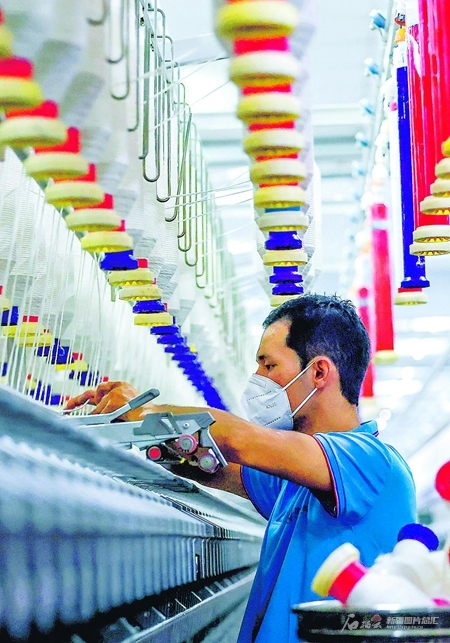 10月14日,新疆协益纺织科技有限公司员工在纺纱车间作业。该公司是阿克苏地区农业产业化重点龙头企业之一,月纺纱量1500吨、织布200万米,带动周边乡镇500名群众就业。袁欢欢摄
