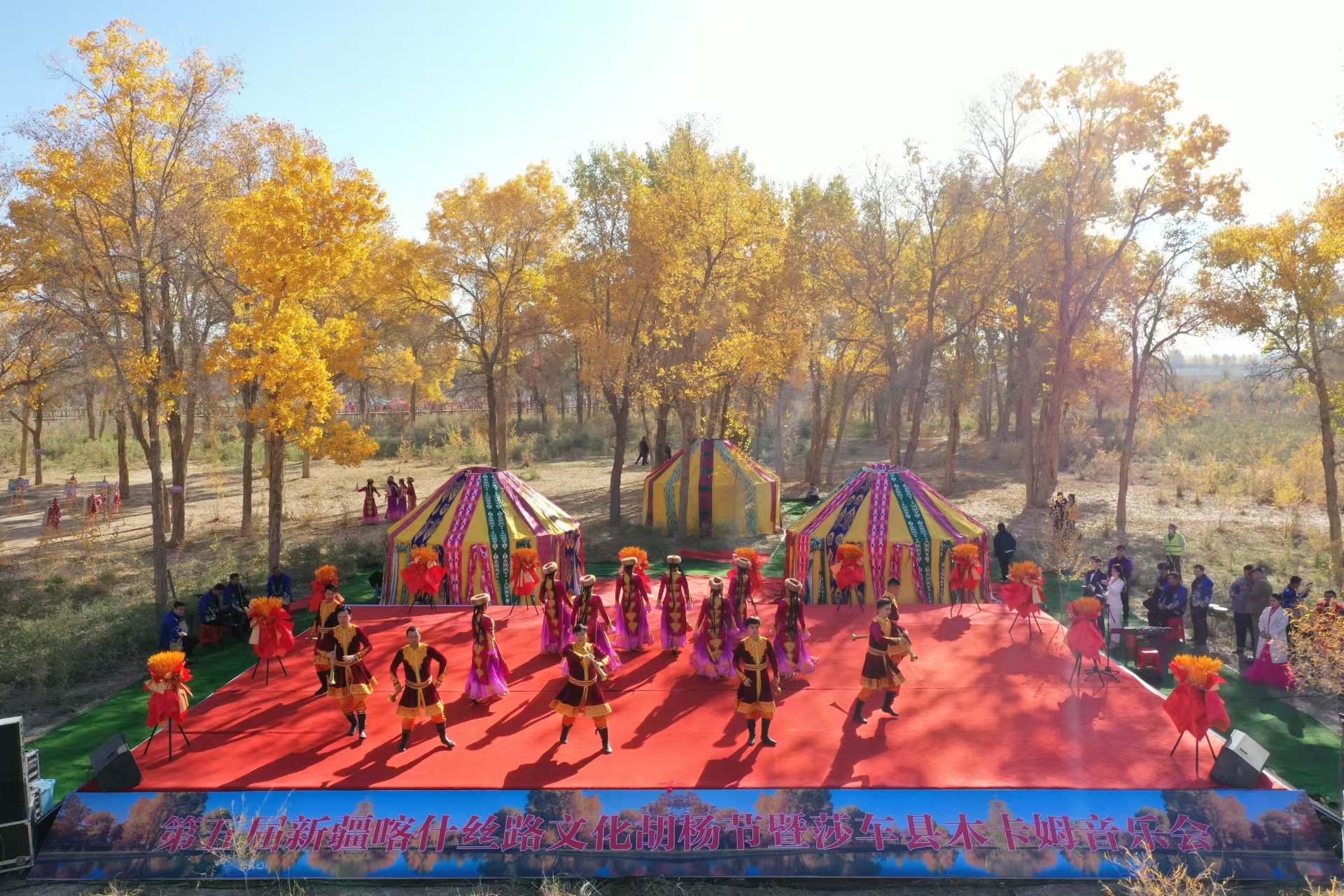 金秋十月,莎车县叶尔羌河两岸仿佛披上了一袭绚烂的金色外衣,在这个诗意与浪漫交织的季节里,第五届新疆喀什丝路文化胡杨节暨莎车县木卡姆音乐会于10月19日在莎车县启幕。这场文化与自然交织的盛宴,吸引了来自疆内外的众多游客,共同见证这一场视觉与听觉的双重享受。