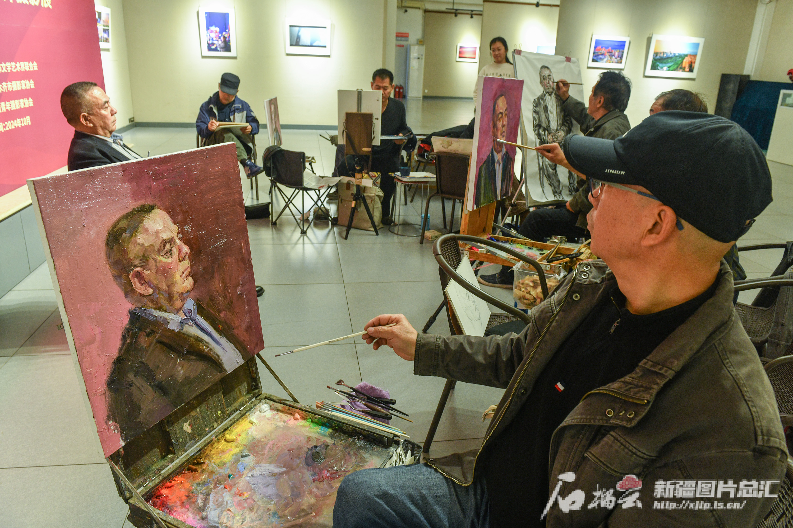 10月19日,在乌鲁木齐市美术馆,艺术家为全国民族团结进步模范个人、自治区助人为乐道德模范海来提·哈得尔画像。