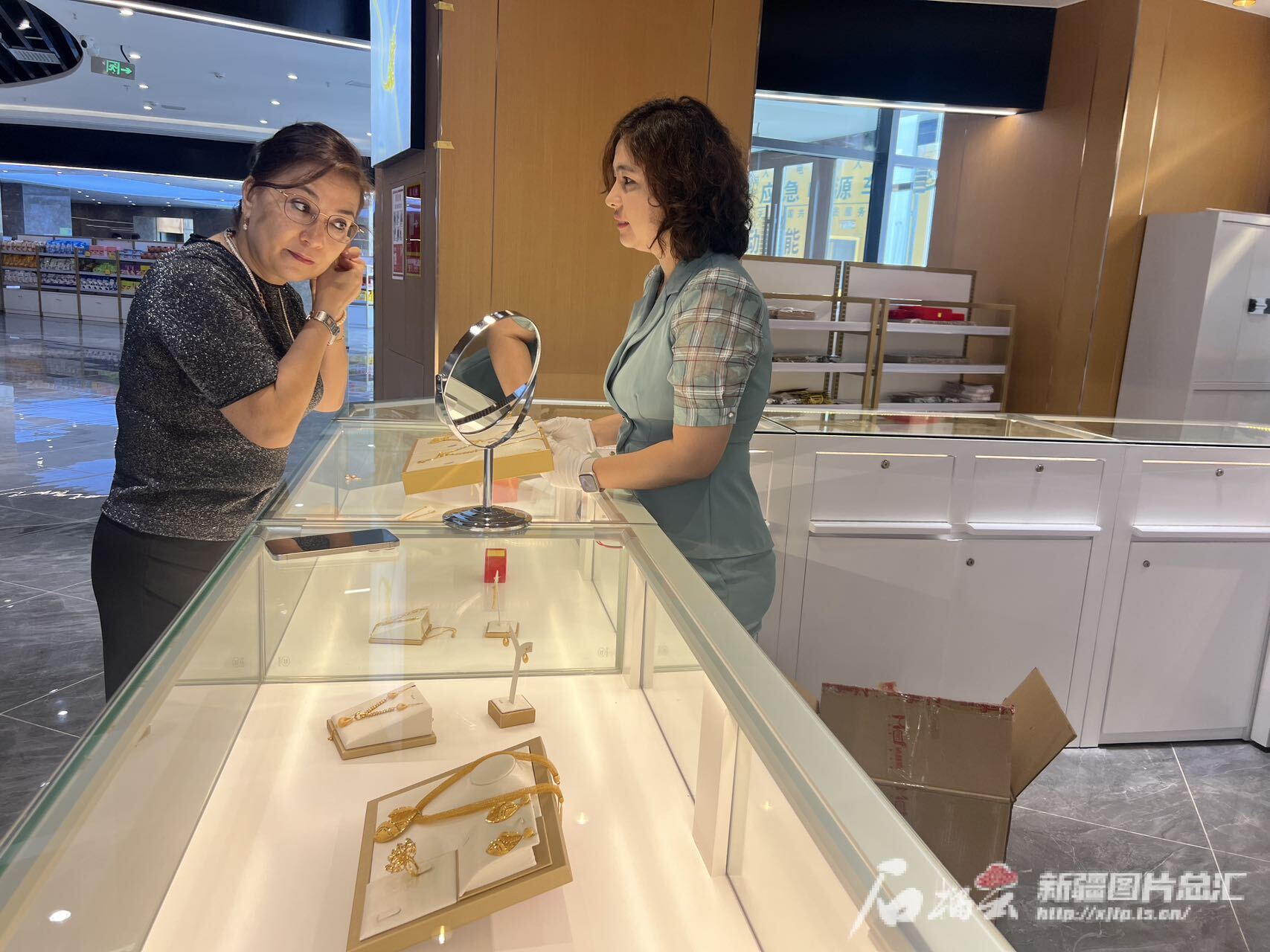 10月12日,喀什跨境电商进出口商品展示交易中心内,新疆合创美新科技发展有限公司的迪拜黄金饰品专柜,顾客正在试戴饰品。天山网-新疆日报记者 拍热扎提·阿不都摄