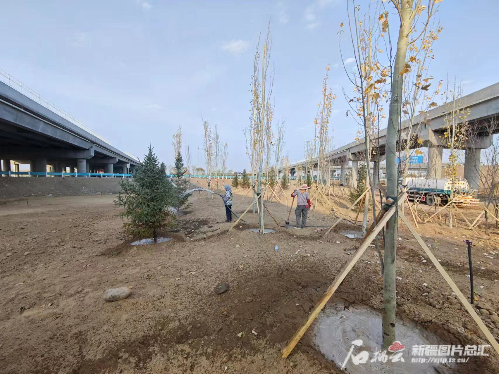 10月21日,工作人员为乌鲁木齐绕城高速(西线)工程沿线新栽的树木浇水。天山网-新疆日报记者 杨斌摄