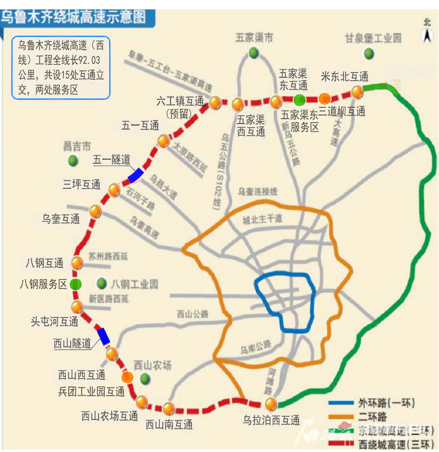 乌鲁木齐绕城高速是新疆高速公路网的重要组成部分,其东线已于2016年建成通车。西线起连霍高速公路小草湖至乌鲁木齐段乌拉泊西互通立交,接乌鲁木齐绕城高速东线,止于米东北枢纽互通,接京新高速公路大黄山至乌鲁木齐段,全长93.616公里,桥梁共计80座,长隧道两座,互通式立交16处,收费站10处等,按照双向8车道高速公路标准设计,设计速度为100千米/小时,路基宽度41米,项目建成后将改善乌鲁木齐市交通条件,构建综合交通运输体系。