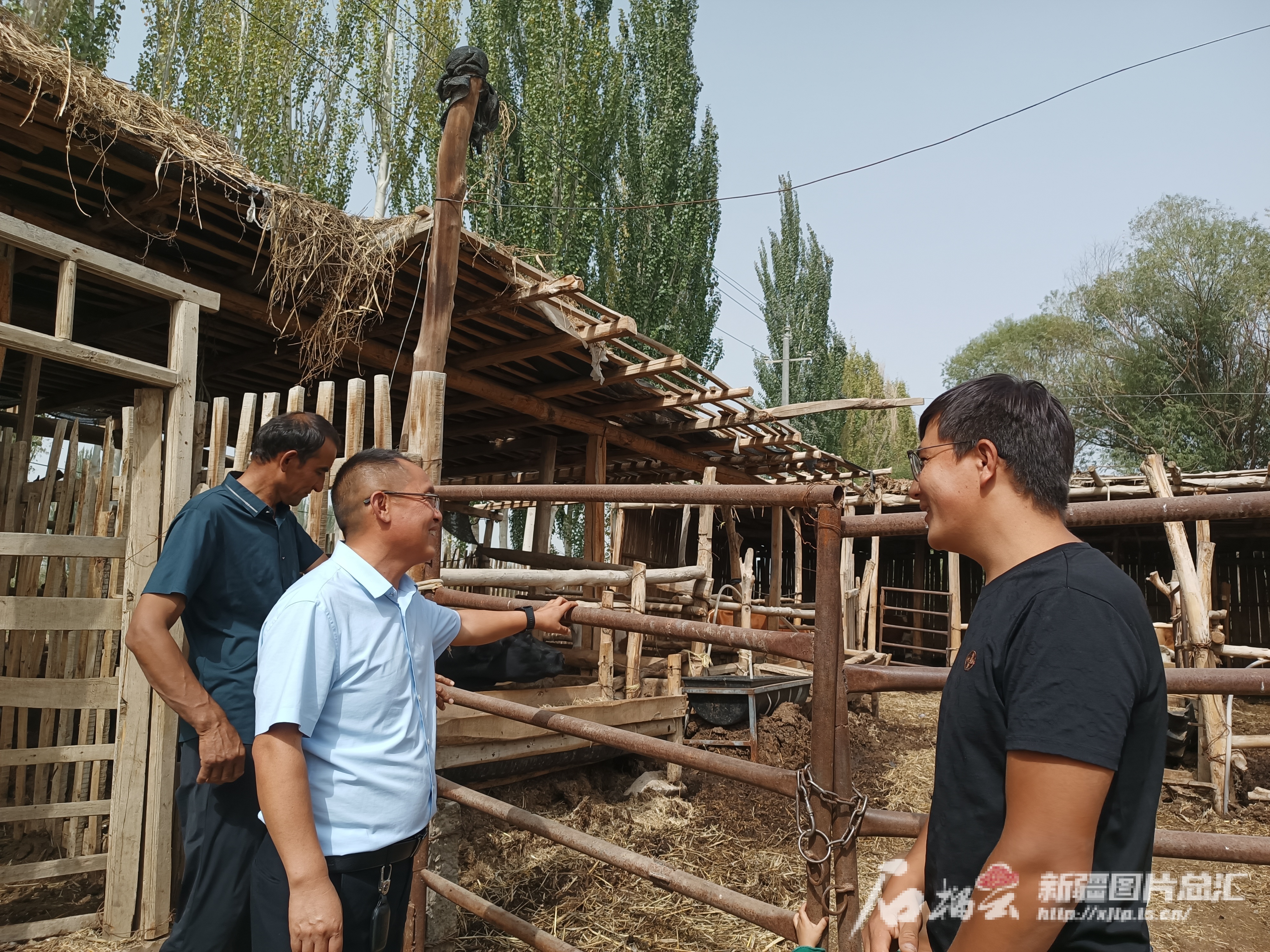 9月25日,吕培贵(中)和亚森·吐孙(左)、包尔汉·亚森(右)查看牛羊养殖情况。天山网-新疆日报记者 张冬梅摄
