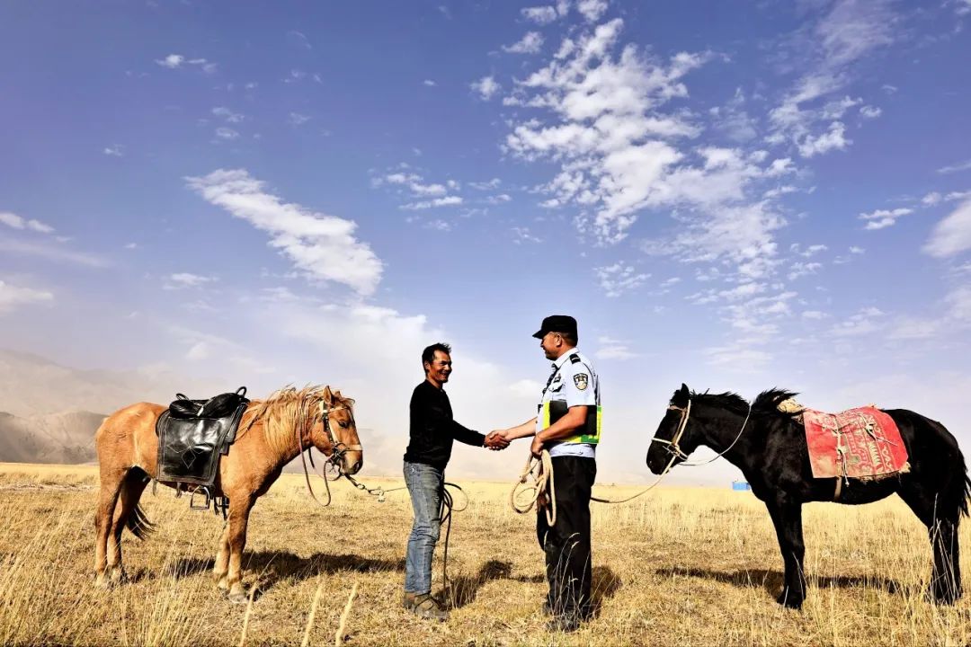 “牧民转场到哪里,我们的工作就要跟进到哪里!”9月30日一大早,吐拉警务室民警辅警拿着牧民新办下来的身份证、户口簿以及精心准备的法律宣传单,跃马扬鞭奔向草原深处,开始了偏远散牧区走访、送证上门、帮扶解困、政策宣传等工作。他们进山必带的,一个是本子,记录着牧民的采购清单,一个是袋子,装着满满的帮助群众采购的物品。他们在被需要的地方扎下根,在被需要的地方捧出爱。