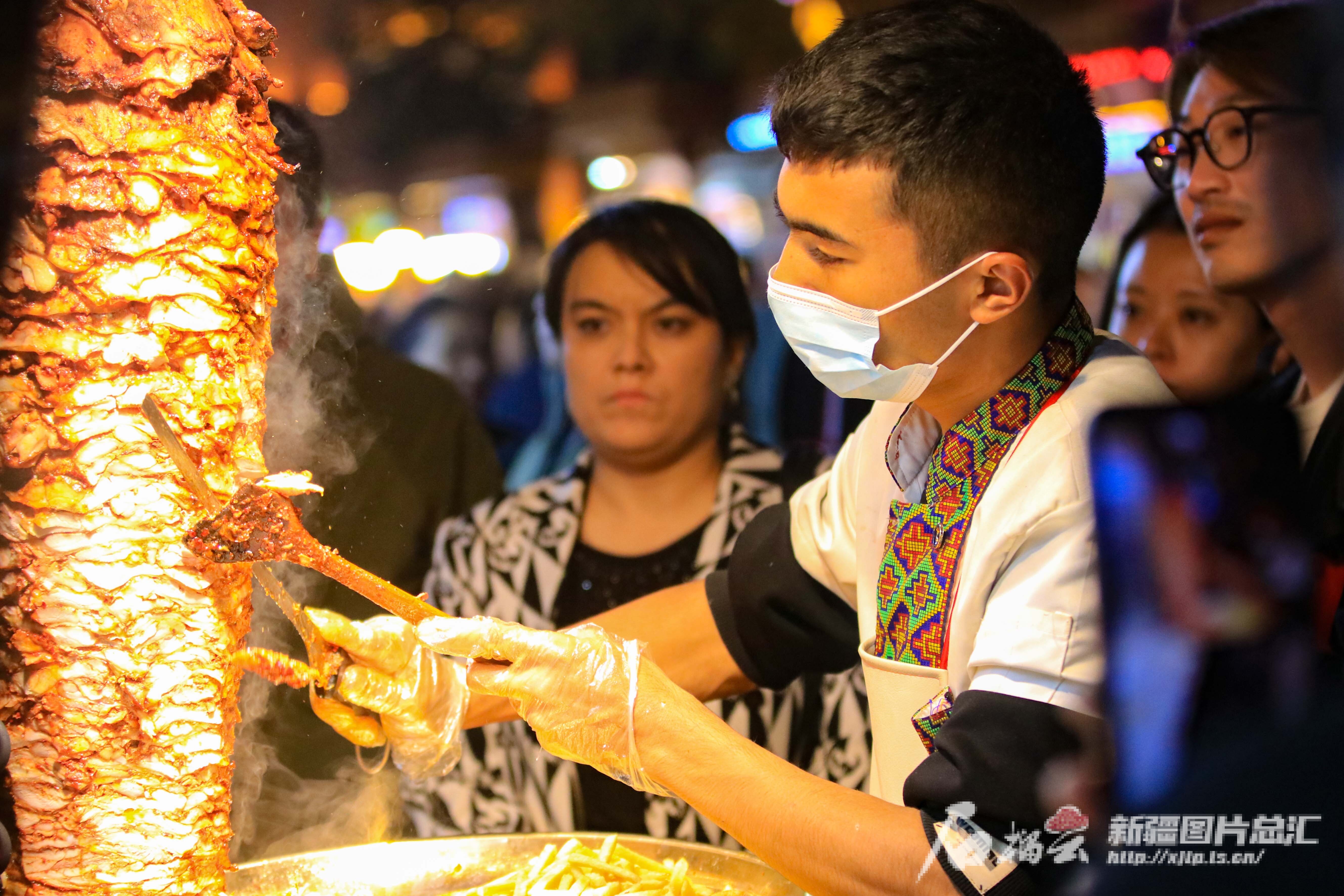 10月24日,烧烤师在喀什古城景区汗巴扎夜市为游客制作鸡肉卷。