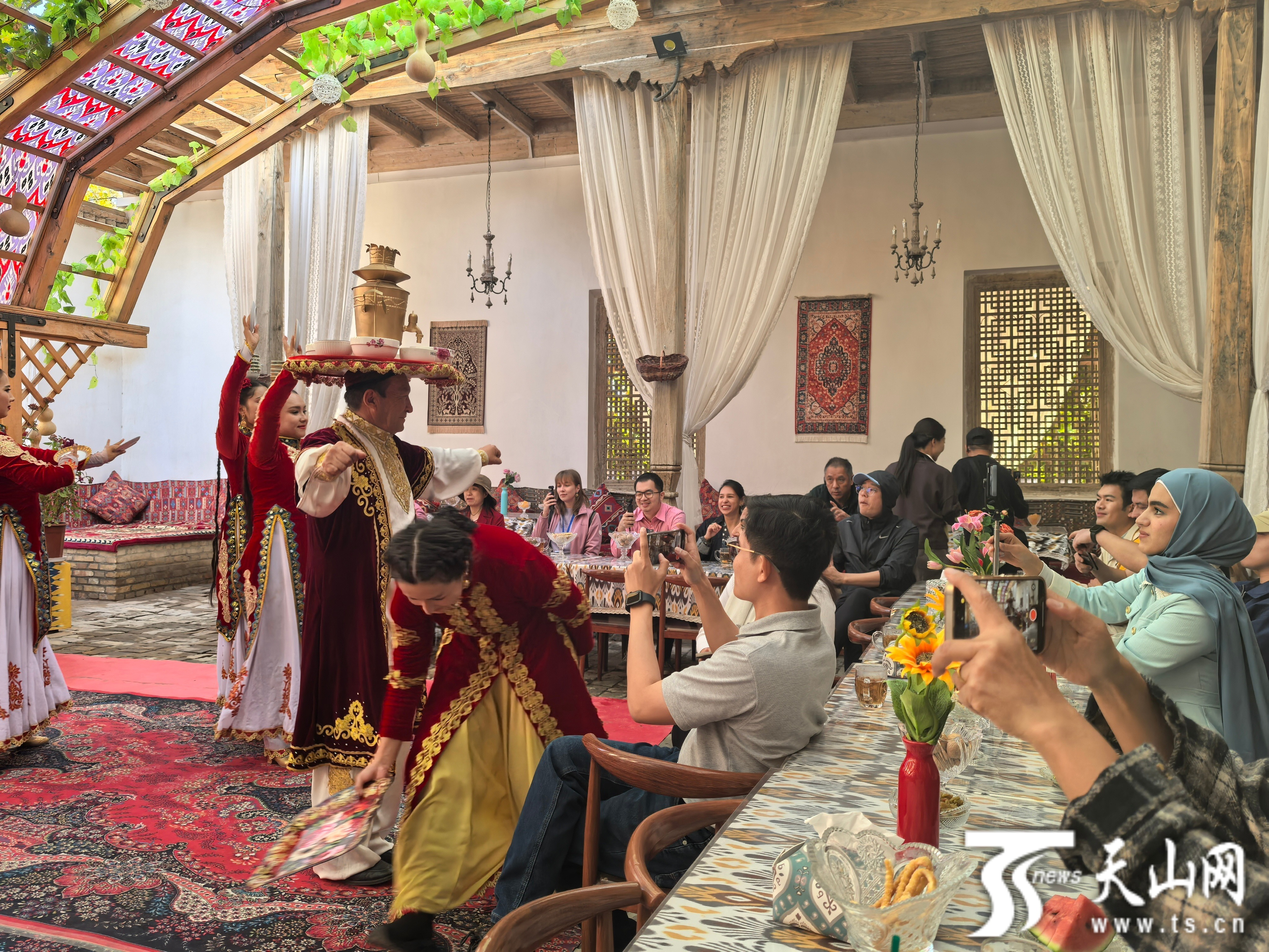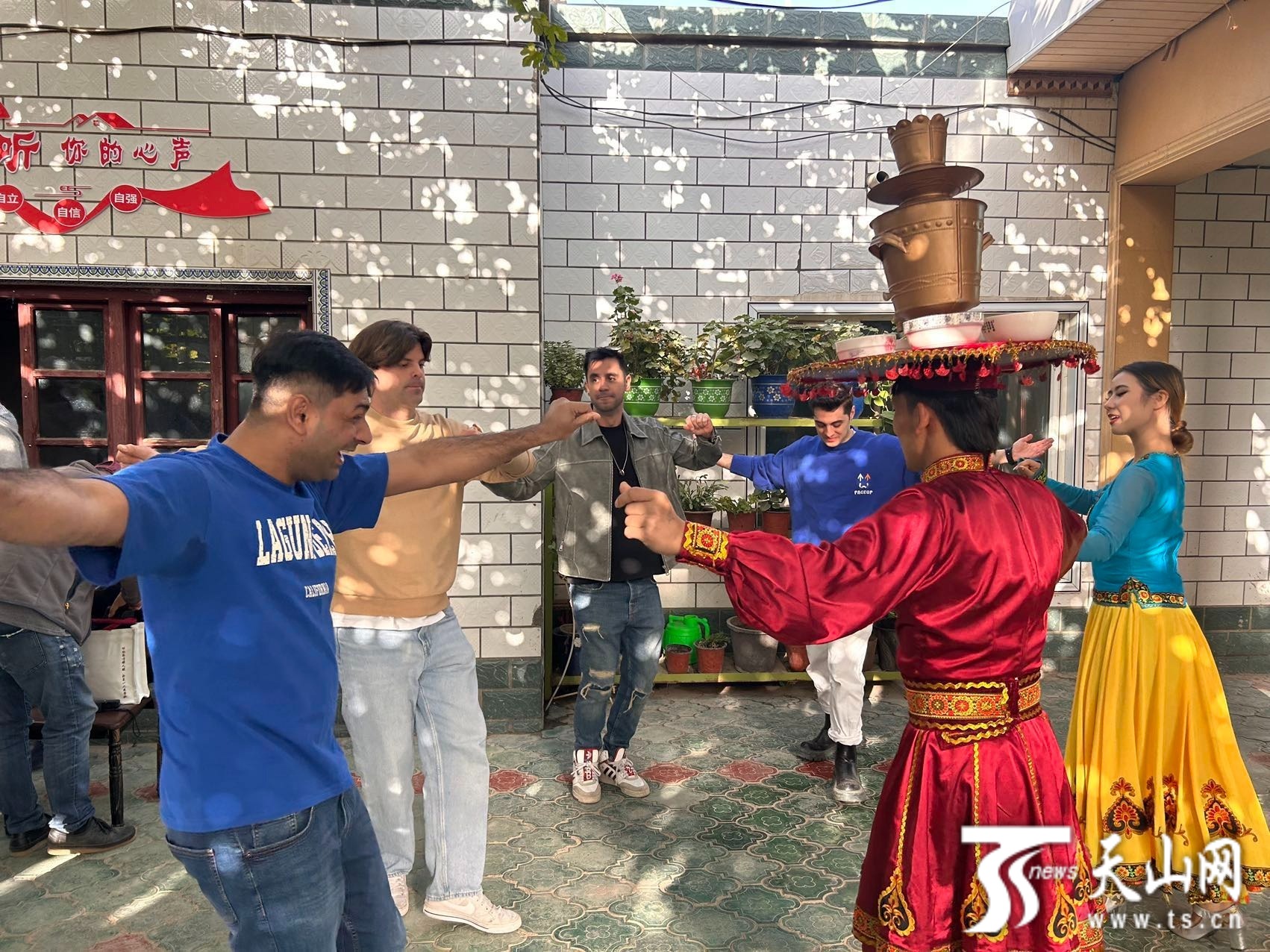 10月23日,在库车市龟兹小巷“爷爷的家”家访点,外籍记者、网红在拍摄《顶碗舞》视频。天山网-新疆日报记者 于江艳摄