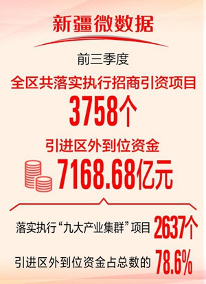 天山网-新疆日报讯(记者黑宏伟报道)记者从自治区商务厅获悉:今年新疆各级招商引资工作部门紧紧围绕高质量发展目标,不断加大力度,扎实推进工作,取得了显著成效。前三季度,全区共落实执行招商引资项目3758个,引进区外到位资金7168.68亿元,已完成年度目标任务的80%。