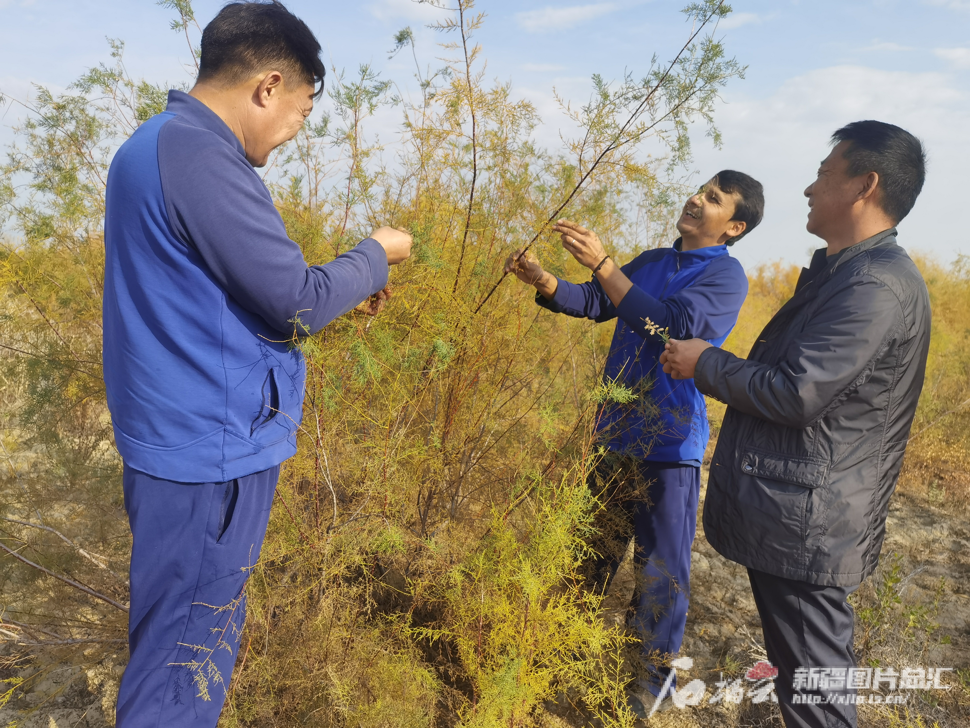 10月24日,五道泉中心管护站站长赵威(右一)和生态护林员吉恩斯·托乎塔巴依(左一)以及宪木希·赛不勒(中)看着今年的柽柳长势茂密,开心不已。 天山网-新疆日报记者 白素君摄