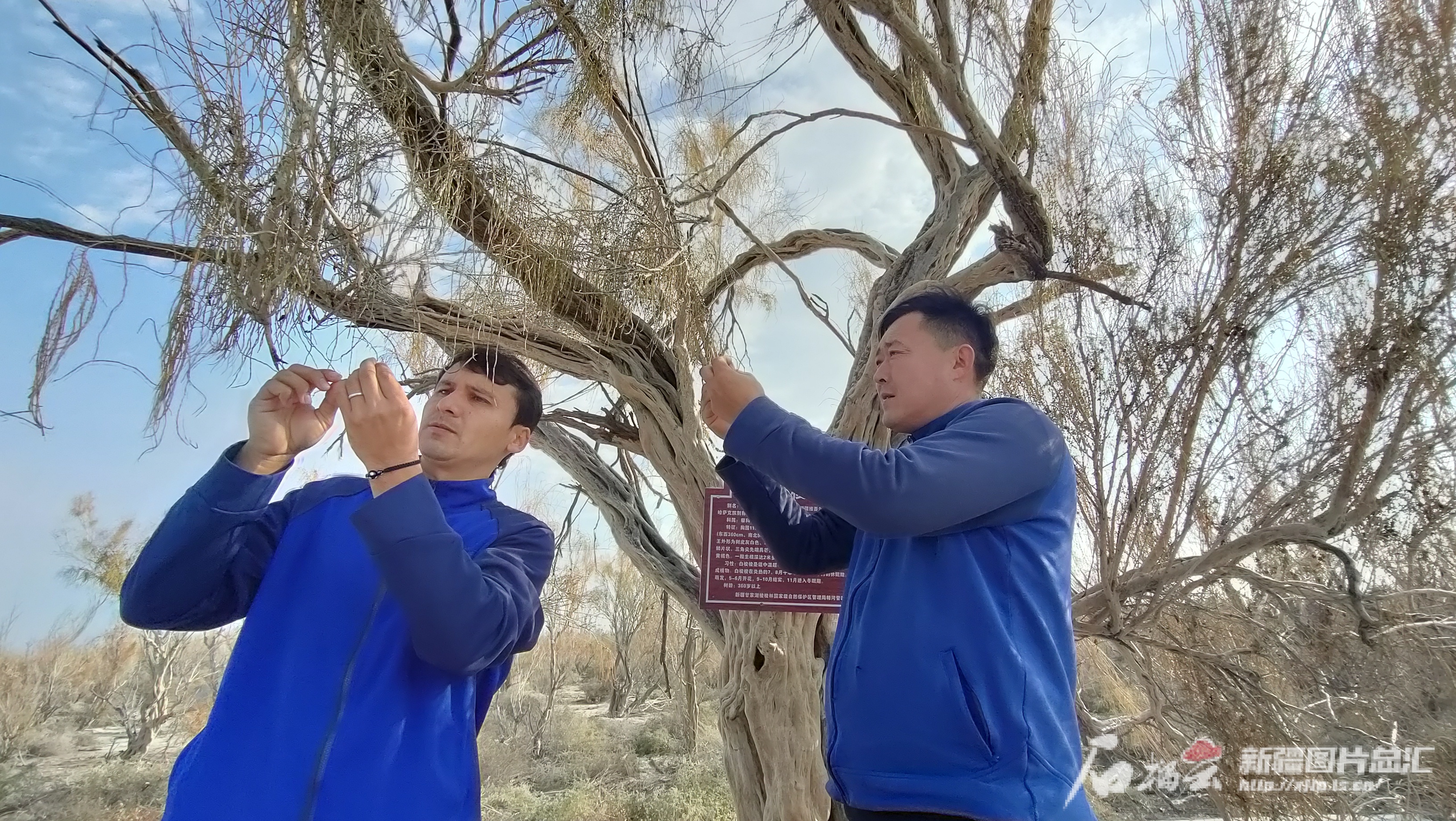 10月24日,生态护林员宪木希·赛不勒(左)和吉恩斯·托乎塔巴依(右)一起看今年白梭梭的开花结果情况。安晓龙摄