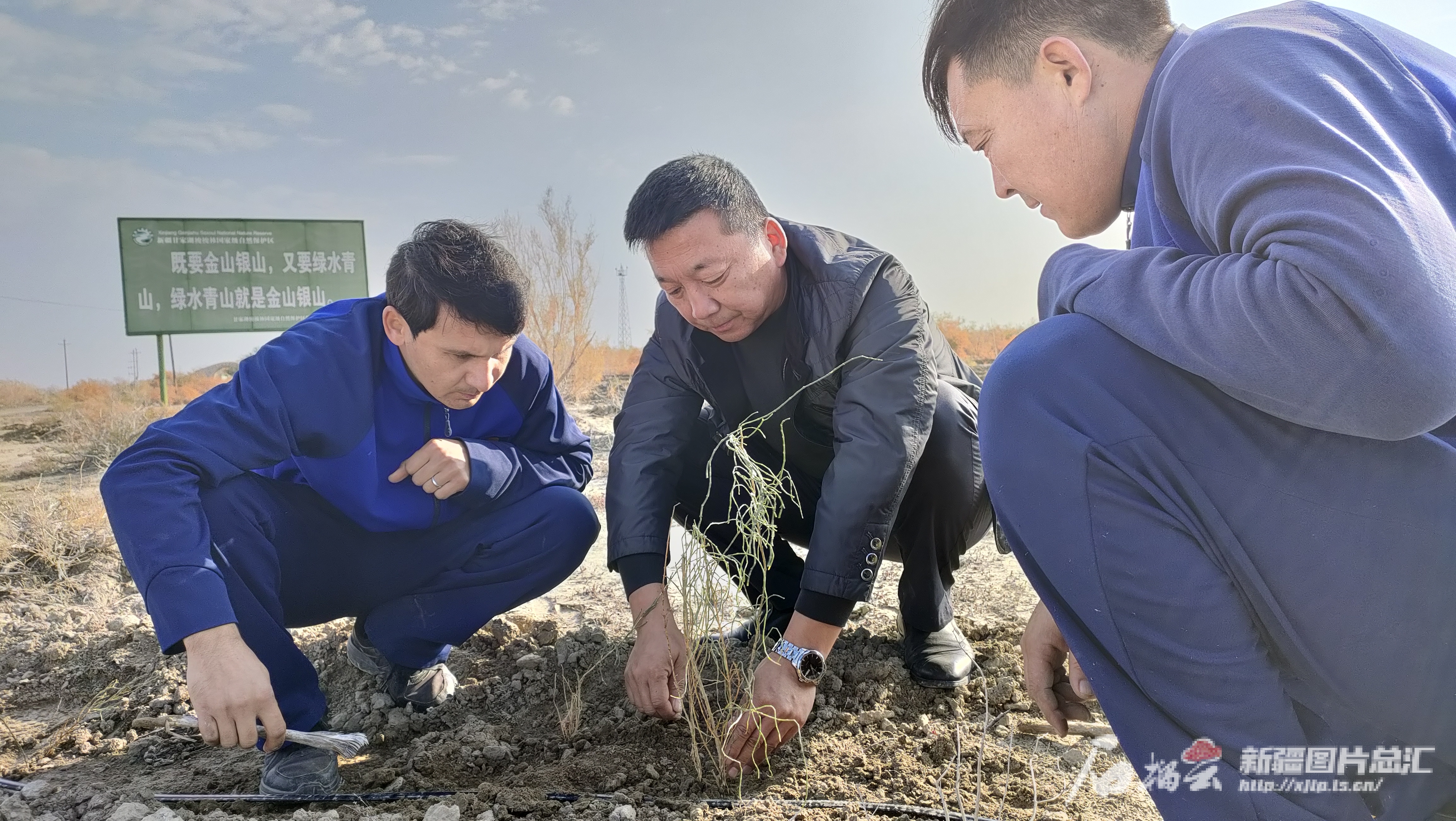 10月24日,五道泉中心管护站站长赵威(中)给生态护林员吉恩斯·托乎塔巴依(右)和宪木希·赛不勒(左)讲解秋季梭梭苗种植时注意事项。安晓龙摄