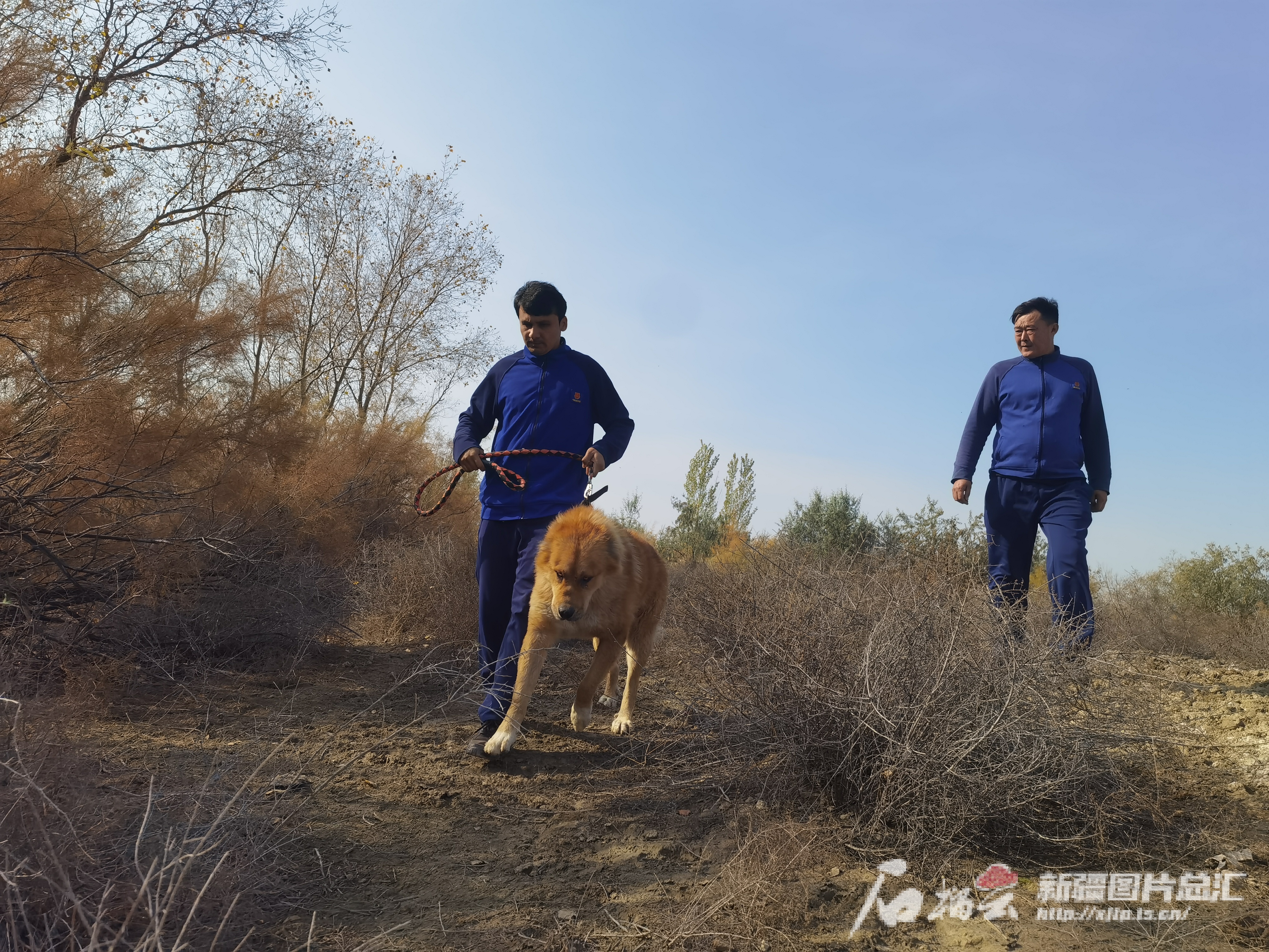 10月24日下午,生态护林员宪木希·赛不勒(左)和吉恩斯·托乎塔巴依(右)牵着牧羊犬从树林中穿过,发现了野猪脚印较多,赶紧加快了步伐。天山网-新疆日报记者 白素君摄