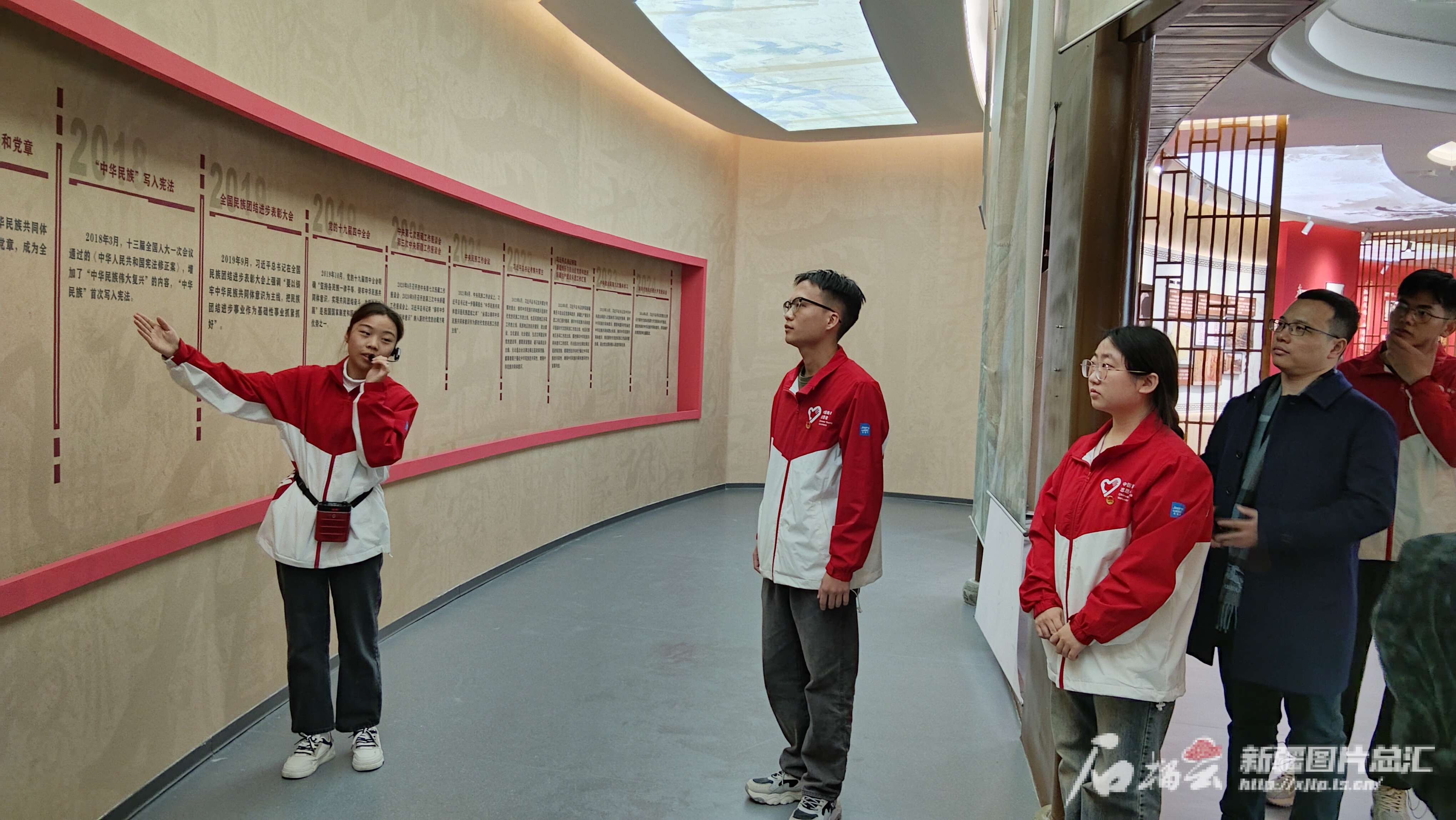 10月23日,2024届西部计划志愿者周敏(左一)正在伊吾县下马崖乡铸牢中华民族共同体意识教育实践基地讲解。石榴云/新疆日报记者 李琳摄