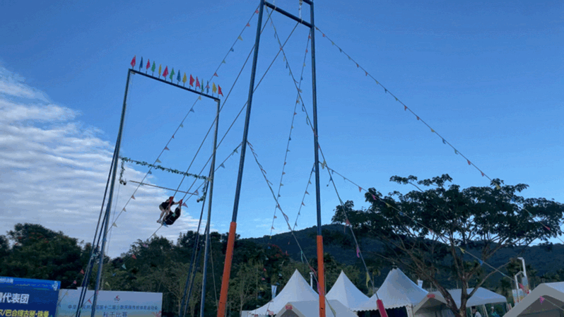 在秋千竞赛项目现场,新疆代表团运动员吾尔尼沙·沙吾尔和巴合提古丽·珠曼以触铃85次的成绩,获得55公斤(以上)级双人触铃二等奖,“发挥出他们平时的训练水平,接下来的比赛需继续努力。”教练李渊超说。