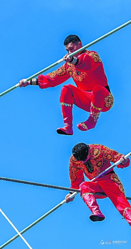 11月24日,新疆代表团达瓦孜队队员在展示空中“飞人”技艺。