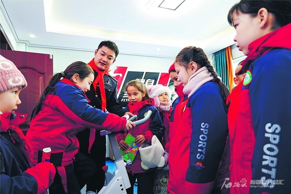 1月5日,民警带领小学生感受警营生活。当日,新疆出入境边防检查总站阿勒泰边境管理支队恰尔夏特边境检查站举办警营开放日活动,邀请吉木乃县直小学部分学生走进警营,共迎第五个中国人民警察节的到来。 □石晓坤摄