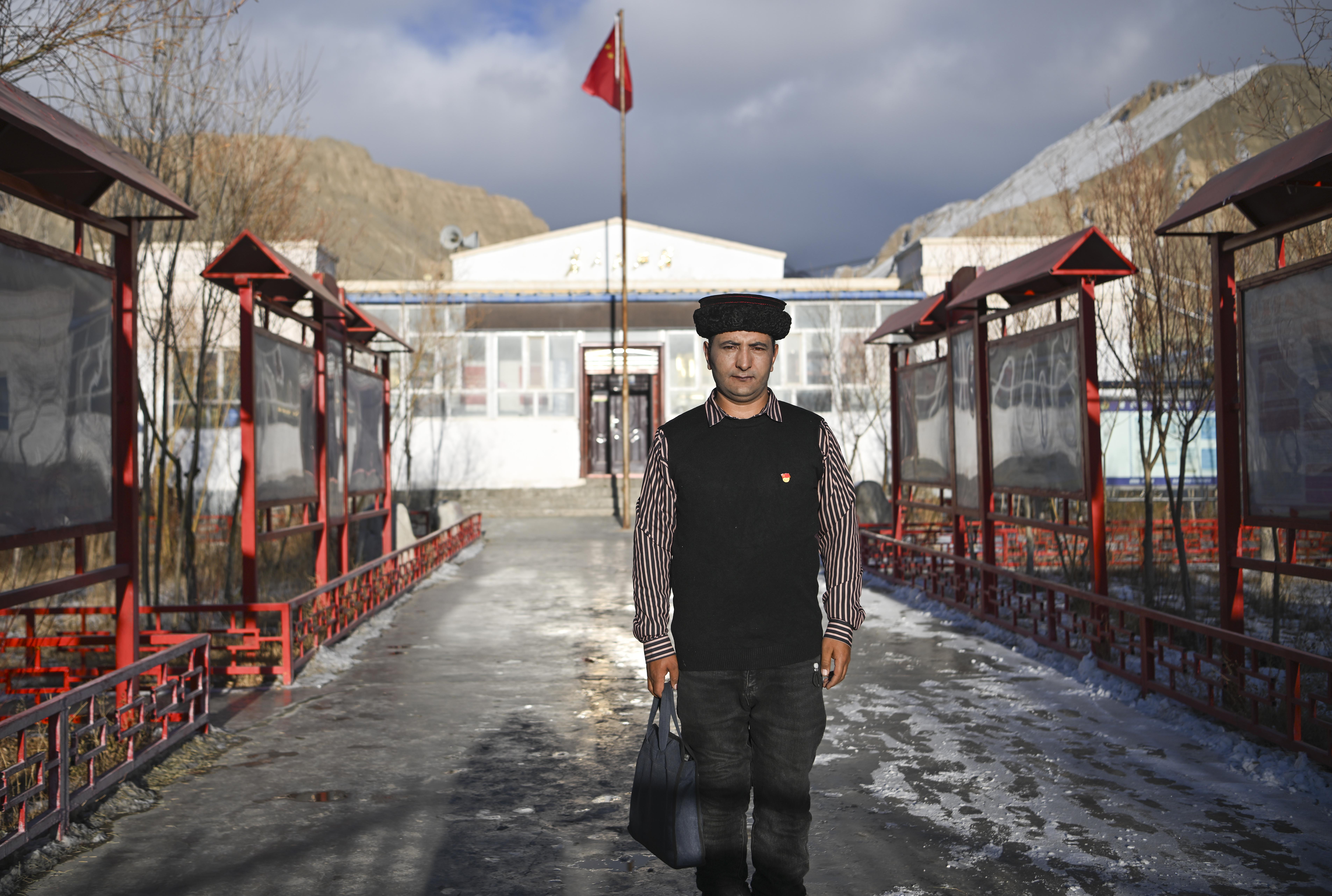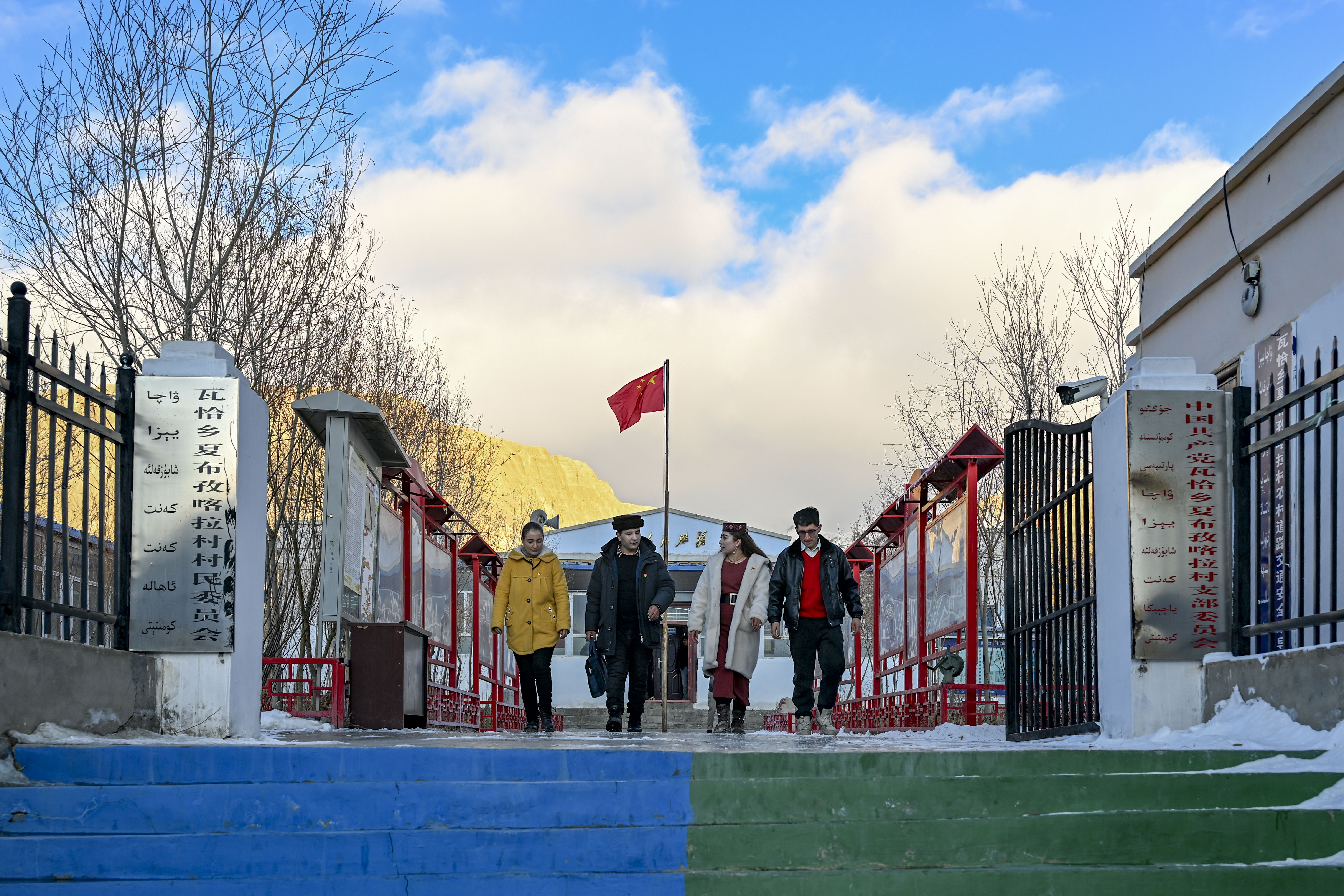 在新疆喀什地区塔什库尔干塔吉克自治县瓦恰乡夏布孜喀拉村,多来提曼·开米克(左二)和同事走出村委会大门,准备到村民家中走访(2025年1月3日摄)。