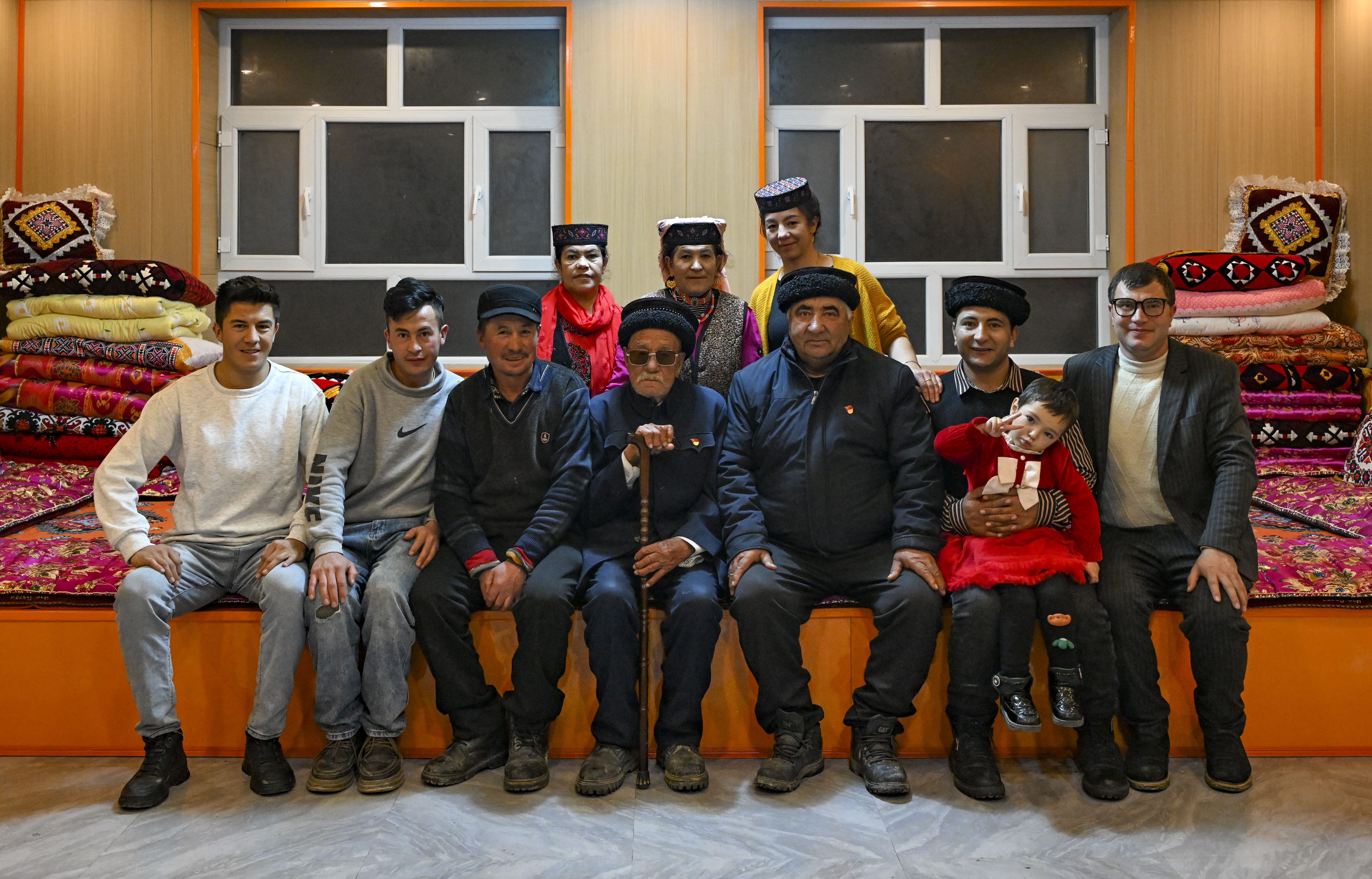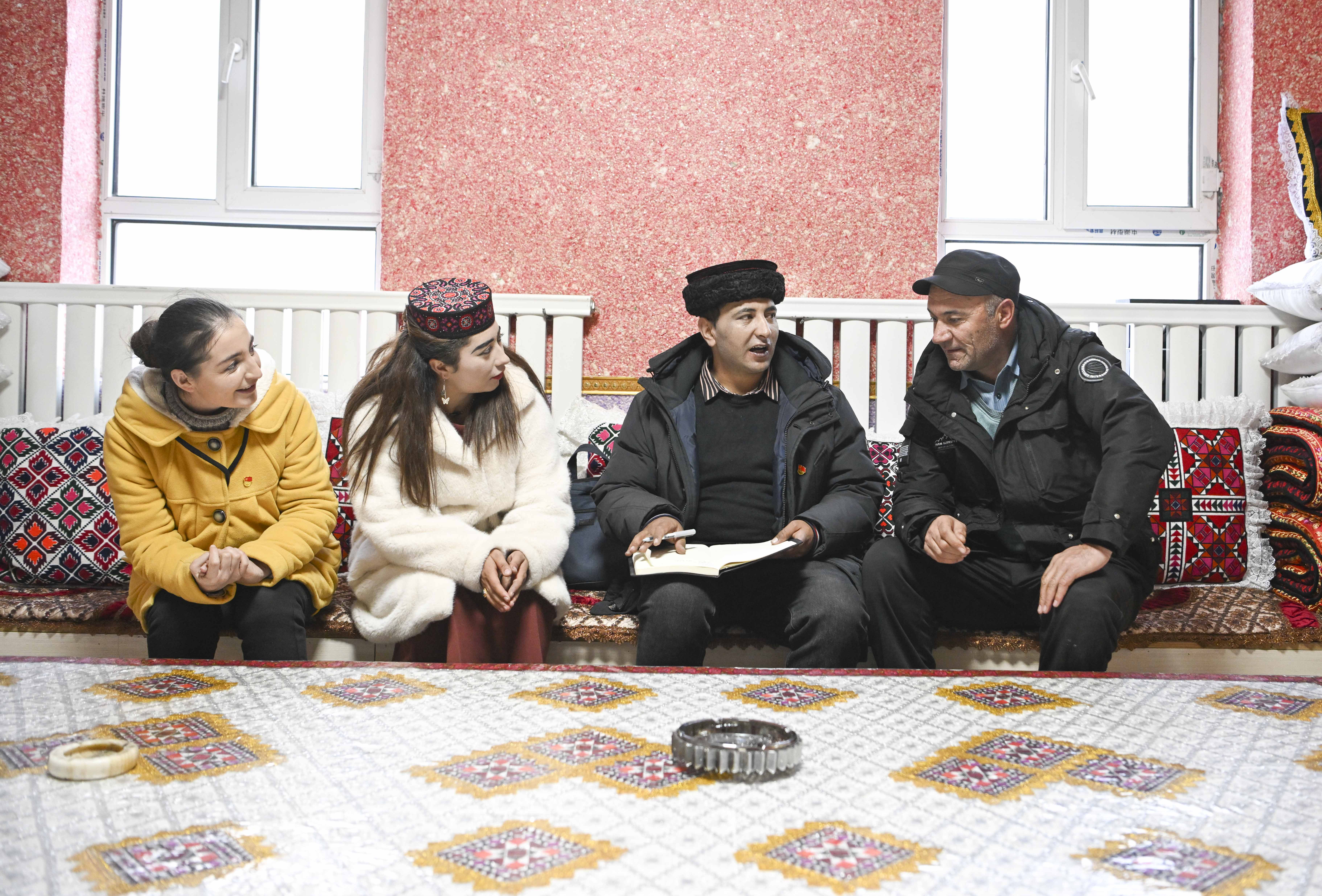 在新疆喀什地区塔什库尔干塔吉克自治县瓦恰乡夏布孜喀拉村,多来提曼·开米克(右二)在牧家乐经营主帕尔吾尼克·吾地那(右一)家中调研,听取他对乡村旅游发展的意见建议(2025年1月3日摄)。