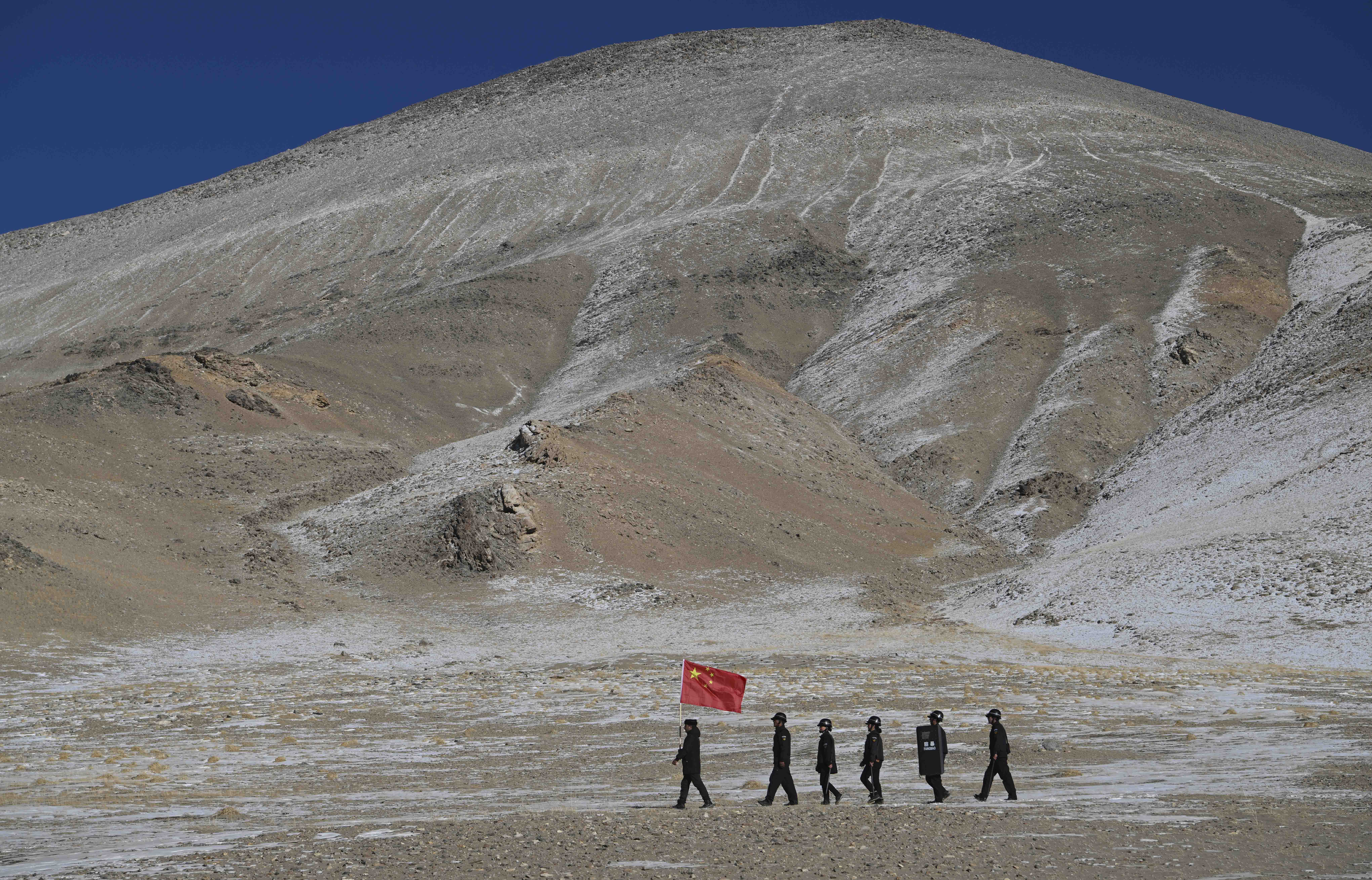 多来提曼·开米克(前)与护边员一起巡边(2025年1月9日摄)。