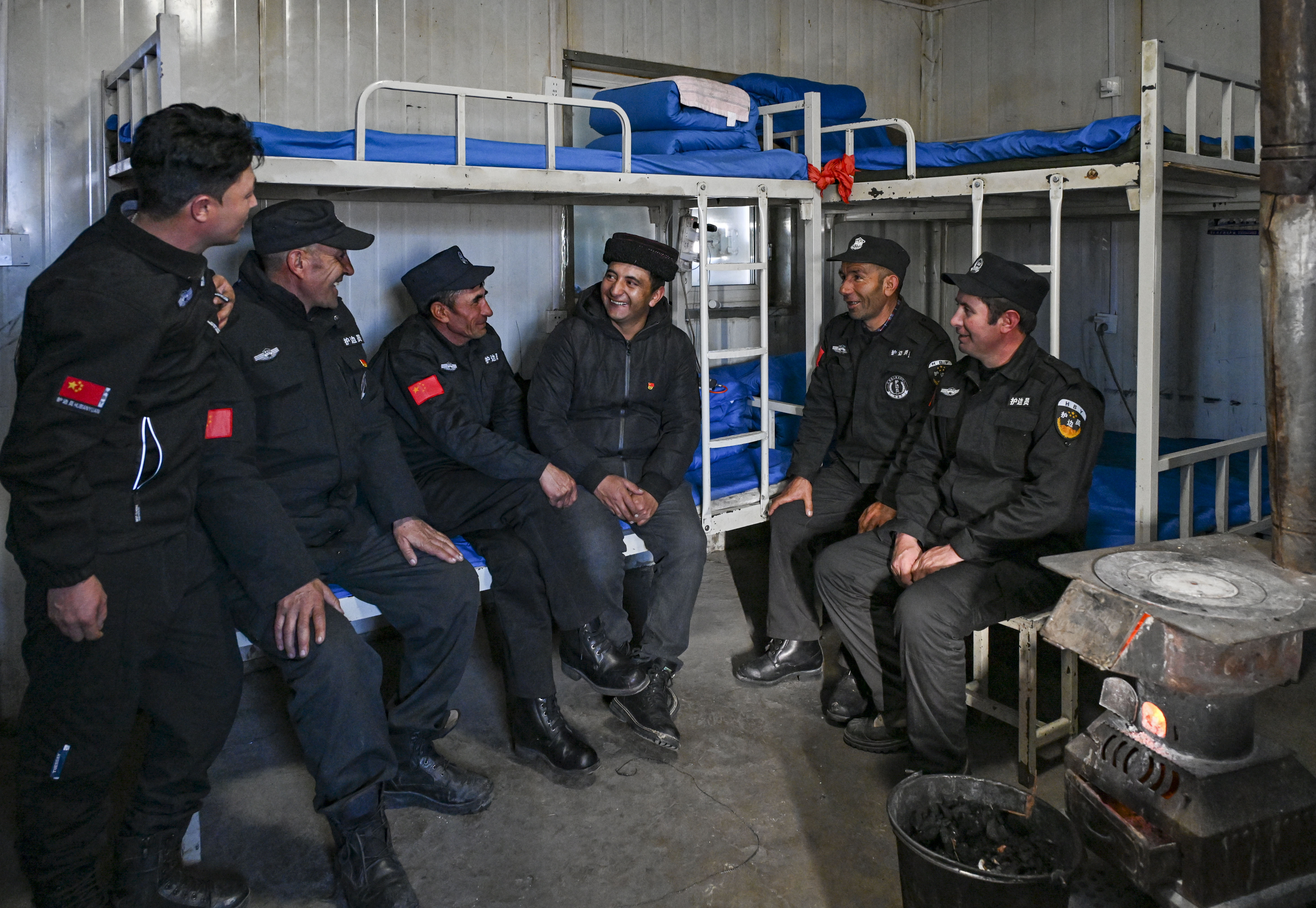 在中国-塔吉克斯坦边境地区的一处执勤点,多来提曼·开米克(右三)同本村护边员交流(2025年1月9日摄)。