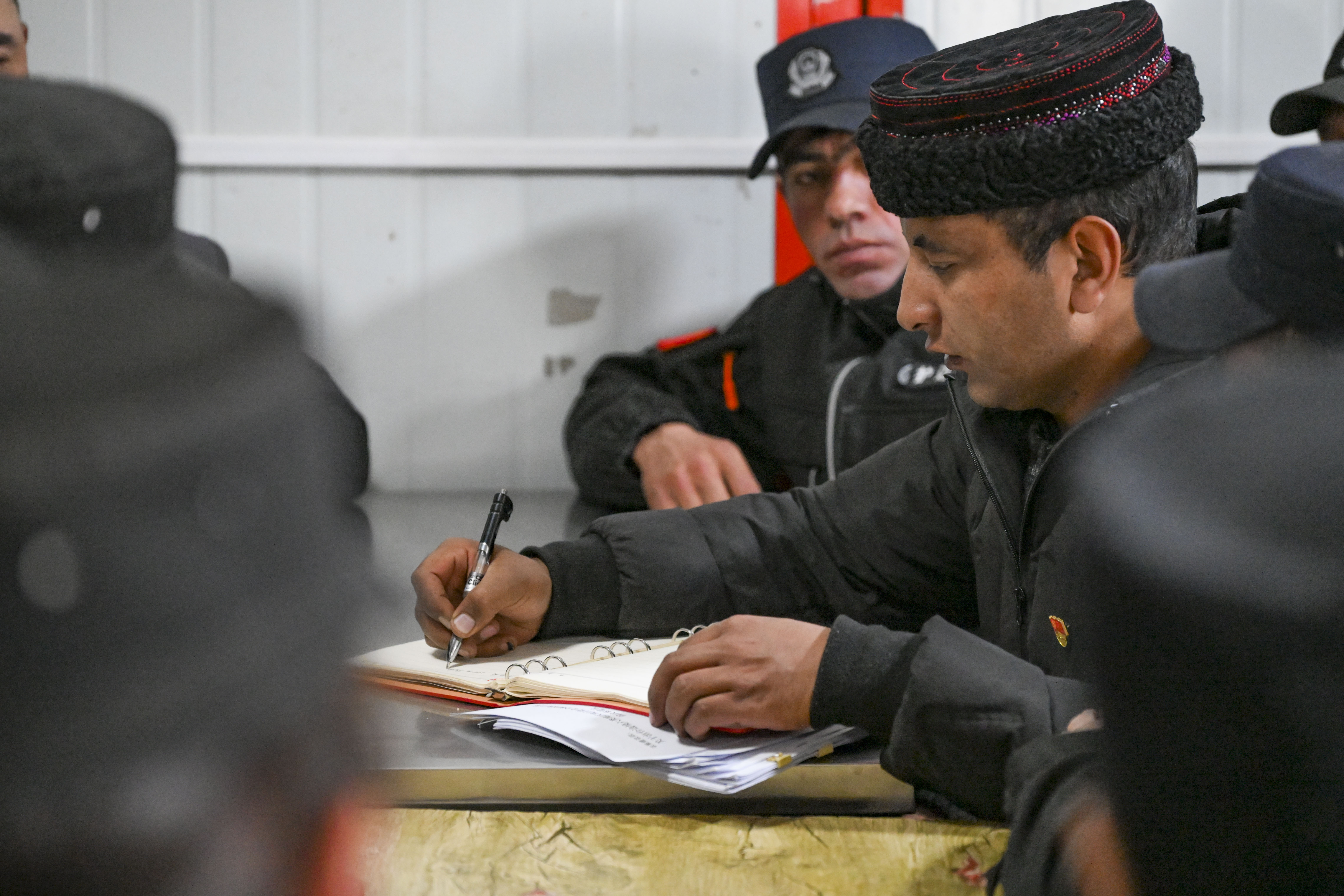 在中国-塔吉克斯坦边境地区的一处执勤点,多来提曼·开米克(右)与护边员交流时记录护边员的反馈(2025年1月9日摄)。
