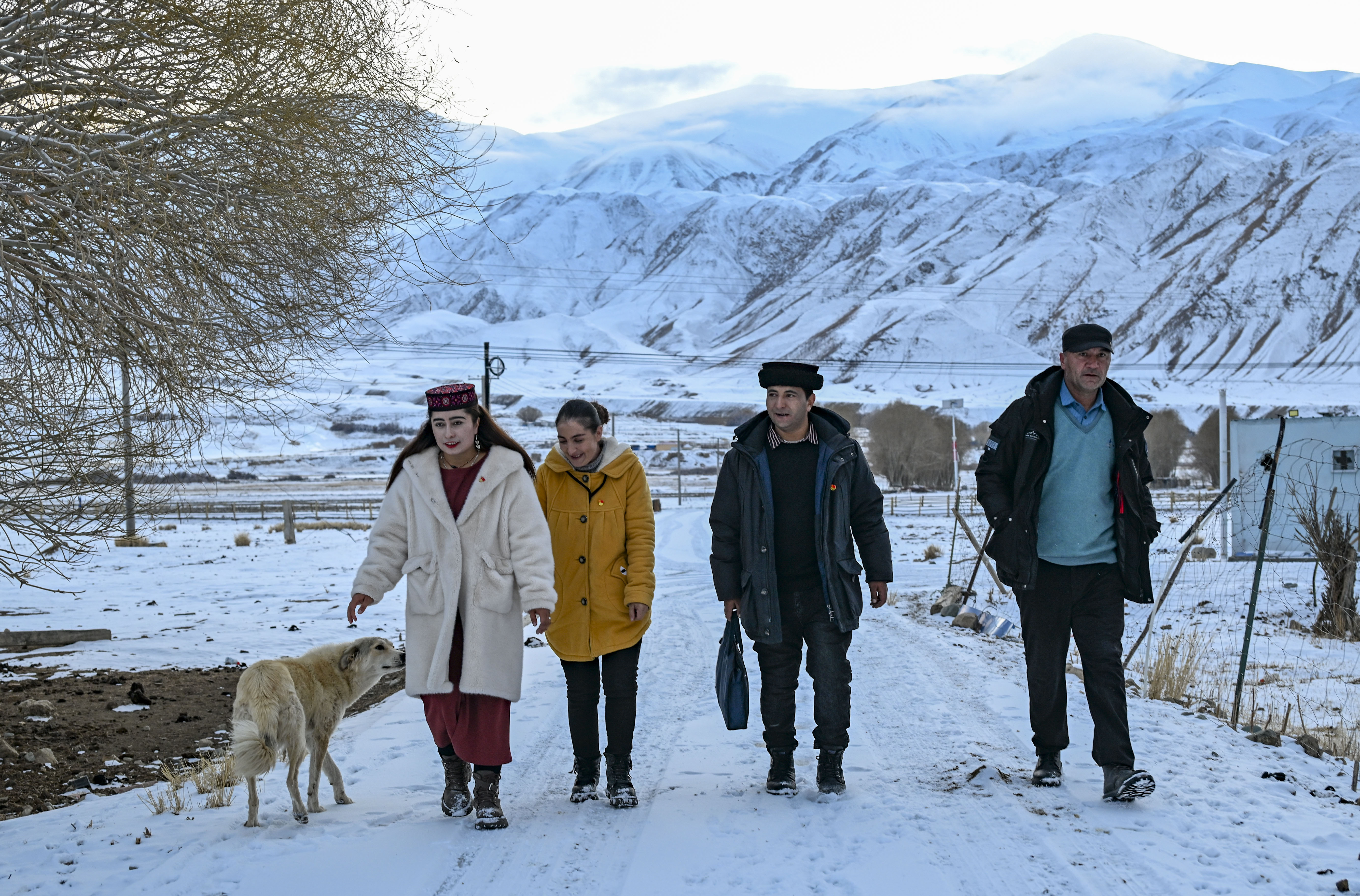 在新疆喀什地区塔什库尔干塔吉克自治县瓦恰乡夏布孜喀拉村,多来提曼·开米克(右二)在村里走访(2025年1月3日摄)。